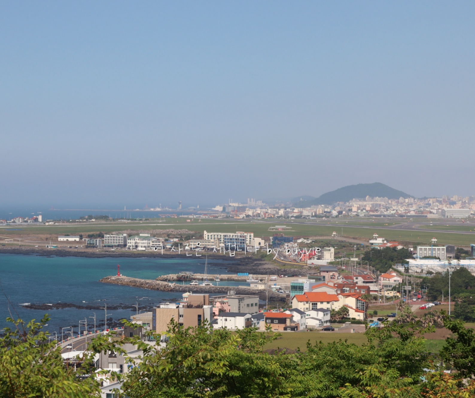 도두봉 정상에서 동쪽을 보면 멀리 제주원도심 끝에 사라봉이 보인다.