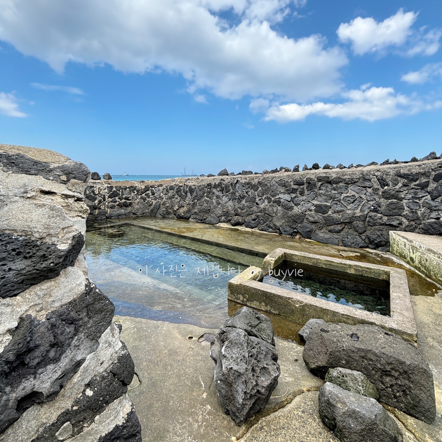 비석 아래 쪽은 엉물이라 해서 용천수가 나오는 물동산이다. 바다 쪽으로 내려가면 물통이 있다. 아직도 맑은 용천수가 솟아나는 예쁜 물통이다. 여긴 노천욕장인 듯.