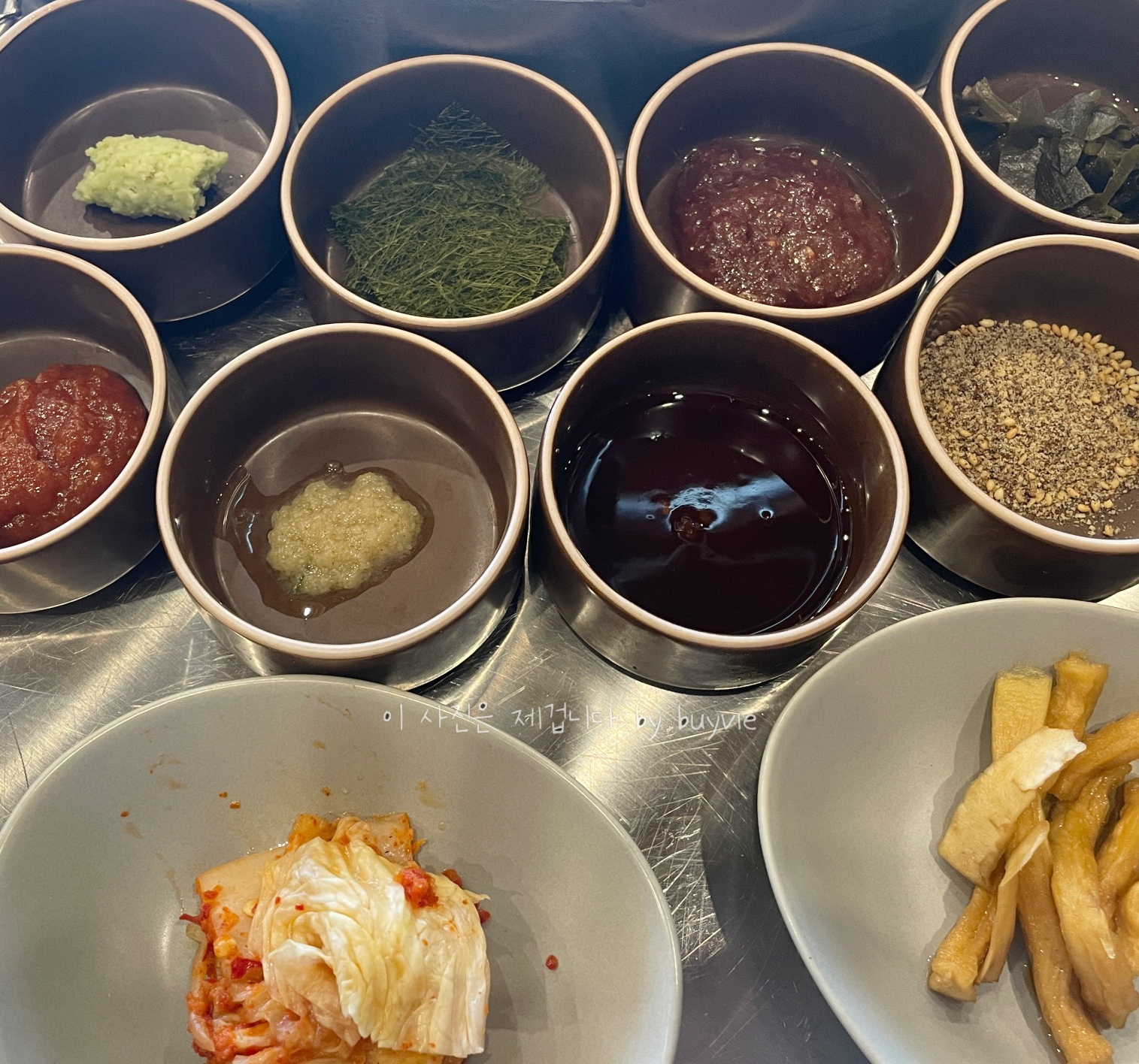 기본찬에 곁들이는 소스와 양념이 8가지, 고추, 마늘, 버섯을 통으로 구워준다.