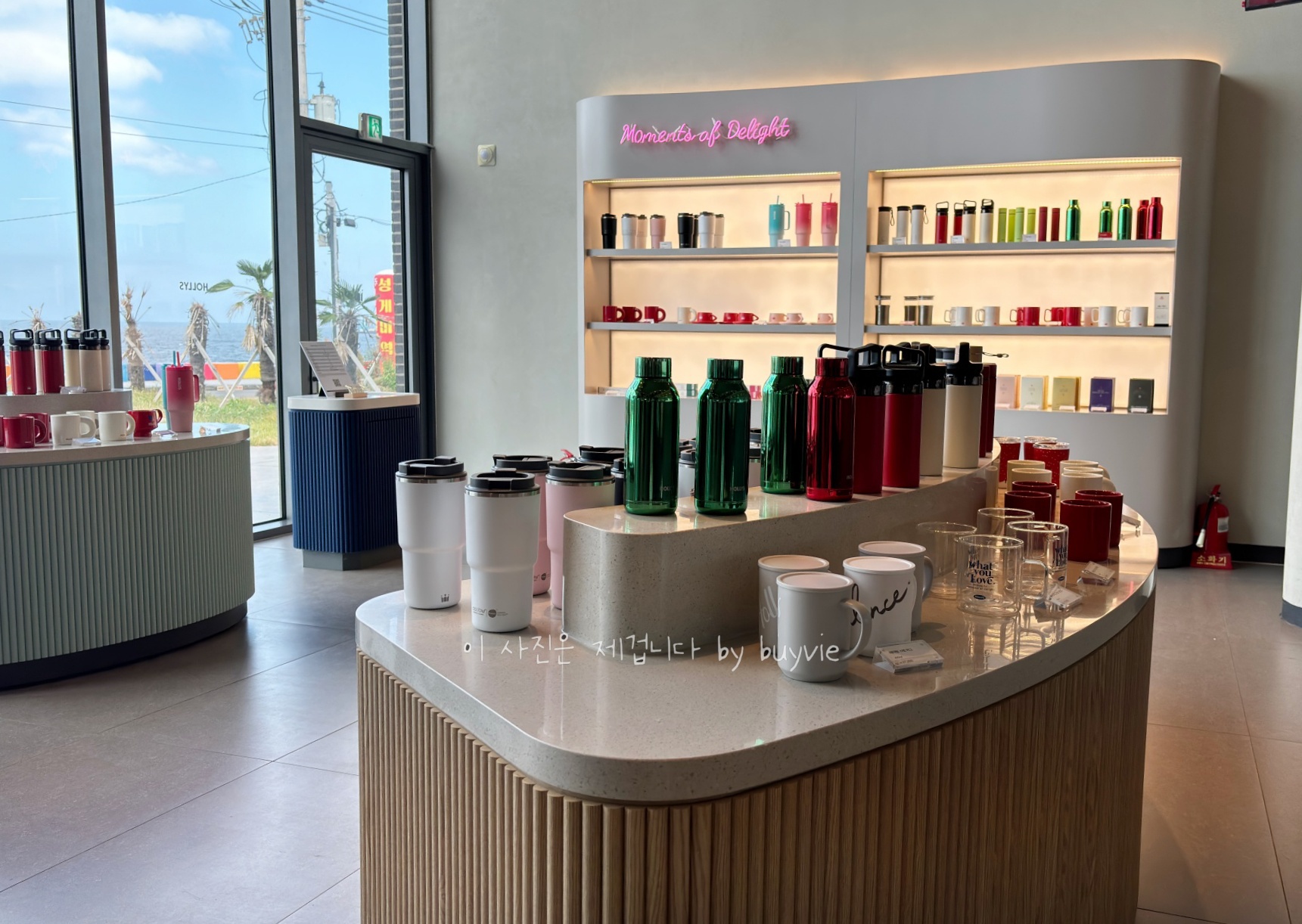 1층 공간은 굿즈 판매를 하는데 특히 텀블러가 다양하다. 제주도에서는 일회용 컵을 줄여나가는 캠페인을 많이 하기 때문에 이 참에 하나 골라봐도 될 듯.