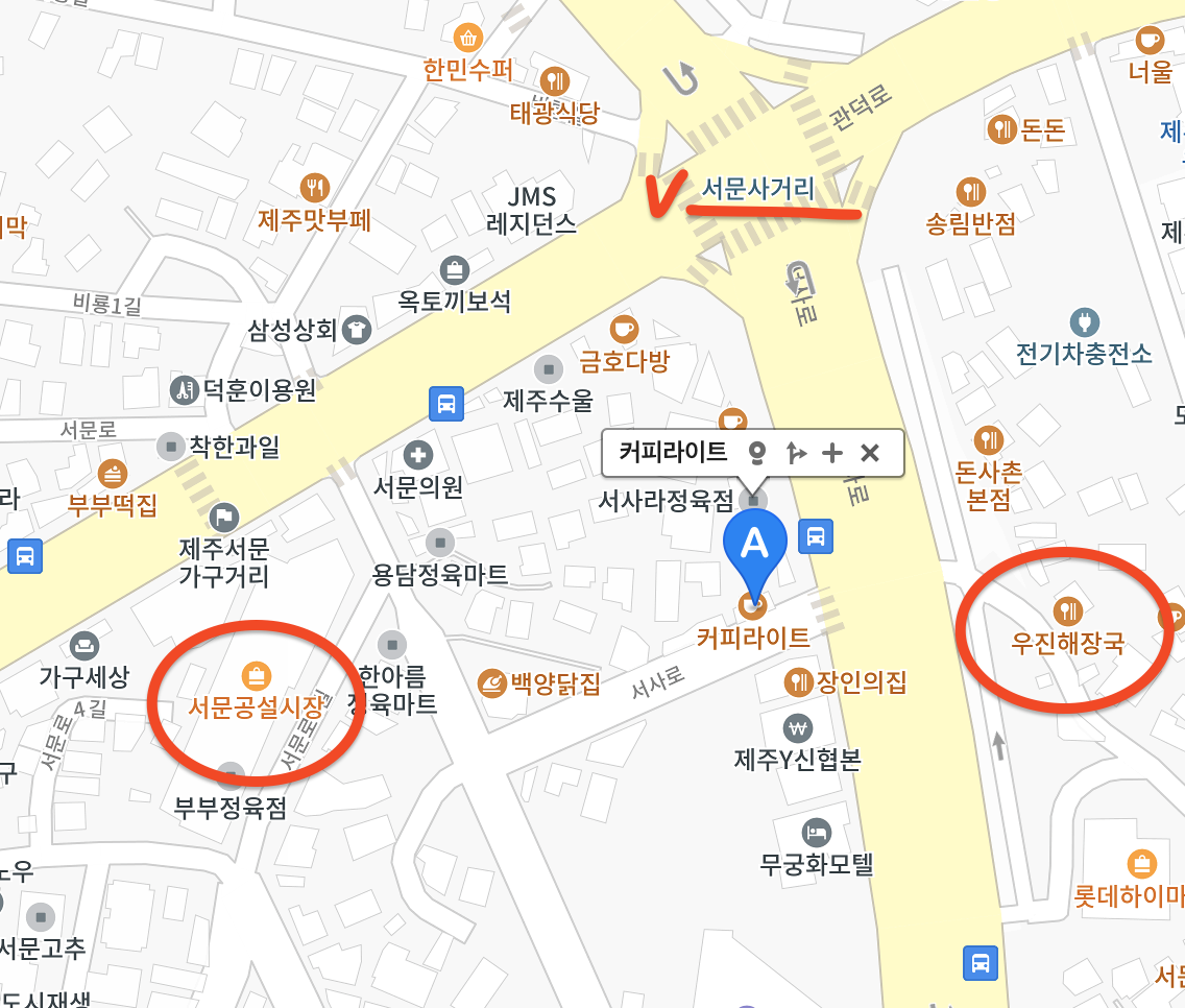 커피라이트는 제주 원도심 서문공설시장 입구에 있습니다. 서문공설시장은 신선한 제주 고기(소고기, 백돼지, 흑돼지)를 정육점에서 구매해 식당에서 구워먹는 곳으로 유명한, 실패없는 제주 고기 구이 맛집입니다. 제가 블로그에도 소개한 적이 있어요. (아래 링크 달아놓을 게요.)