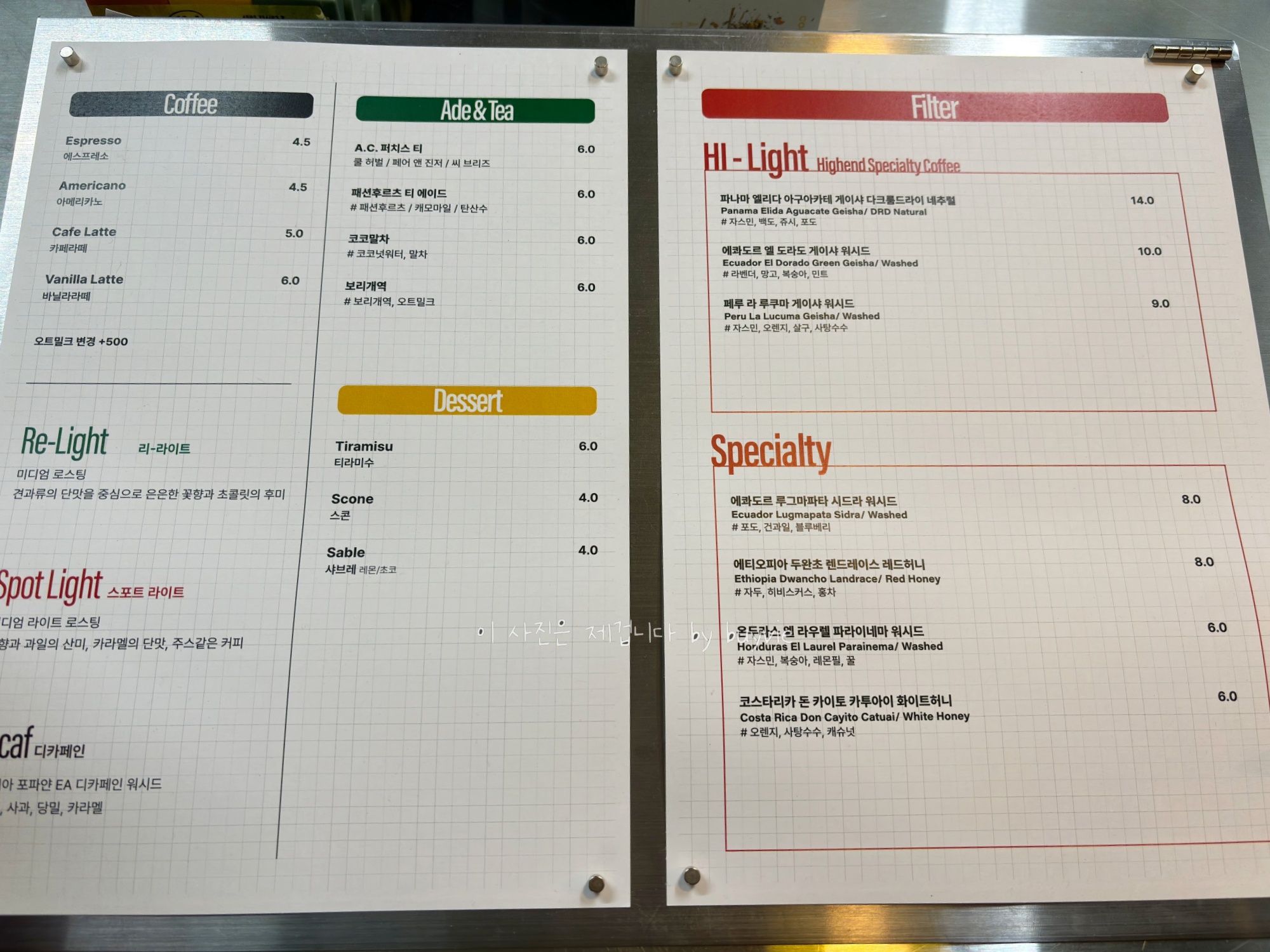마지막 손님이다 보니 간단히 아메리카노(4,500원) 주문했어요. 원두는 리라이트(견과류 단맛에 끝맛은 초콜릿), 스포트라이트(리라이트보다 산미 있고 카라멜 단맛), 디카페인 중 고를 수 있습니다. 저는 산미 있는 스포트라이트를 마셨어요.
