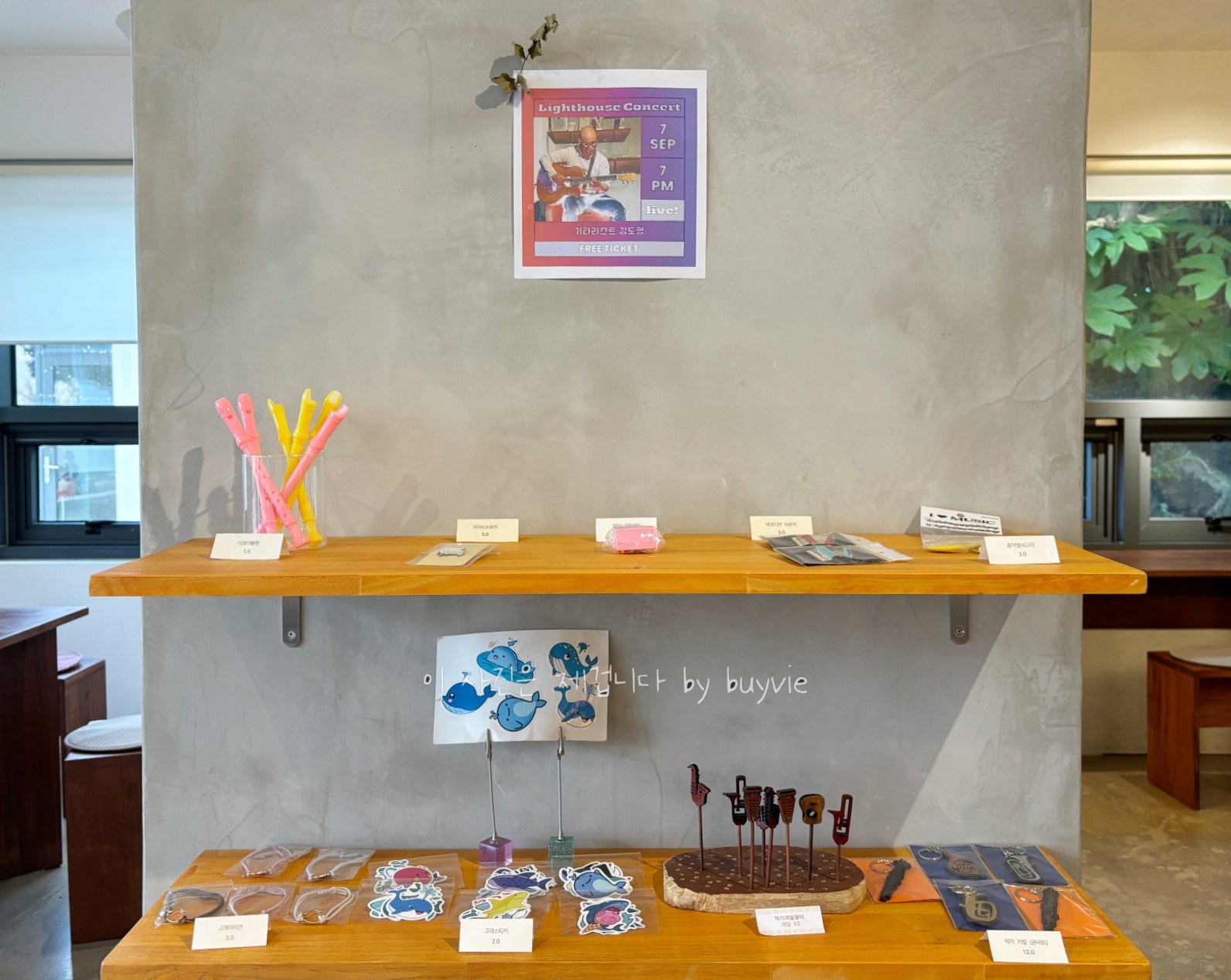 굿즈도 판매하고 있어요. 그러고 보니 커피도 있고, 책도 있고, 굿즈도 있고, 뷰도 좋고, 전시회, 버스킹도 하고, 뭐 없는 게 없네요.