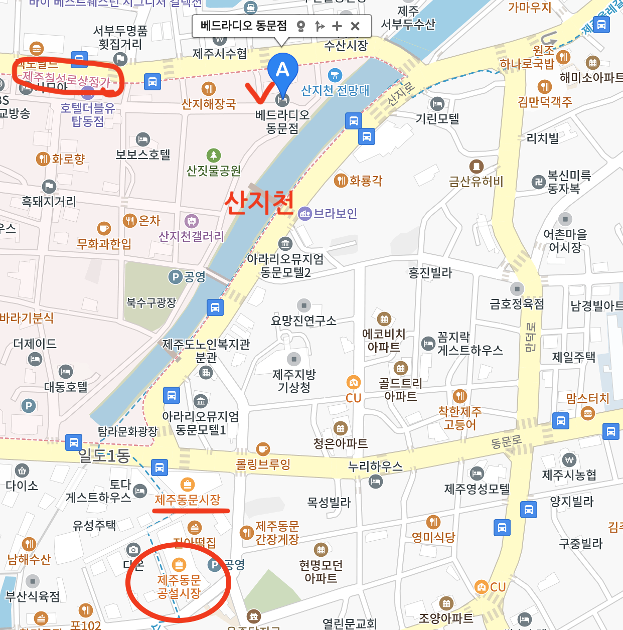 베드라디오 동문점은 제주도 구도심을 여행하기 좋은 곳입니다. 제주공항과 가까워서 대중교통으로도 20분이면 올 수 있고, 제주항으로 흘러가는 산지천을 옆에 두고 있습니다. 제주올레 코스로는 18코스 가운데 쯤 위치하고 있습니다.