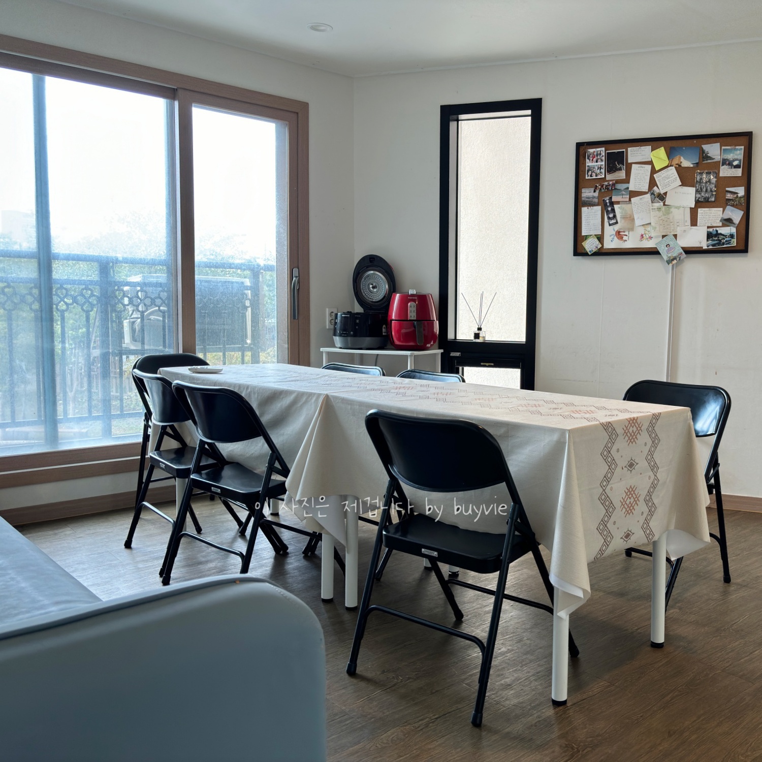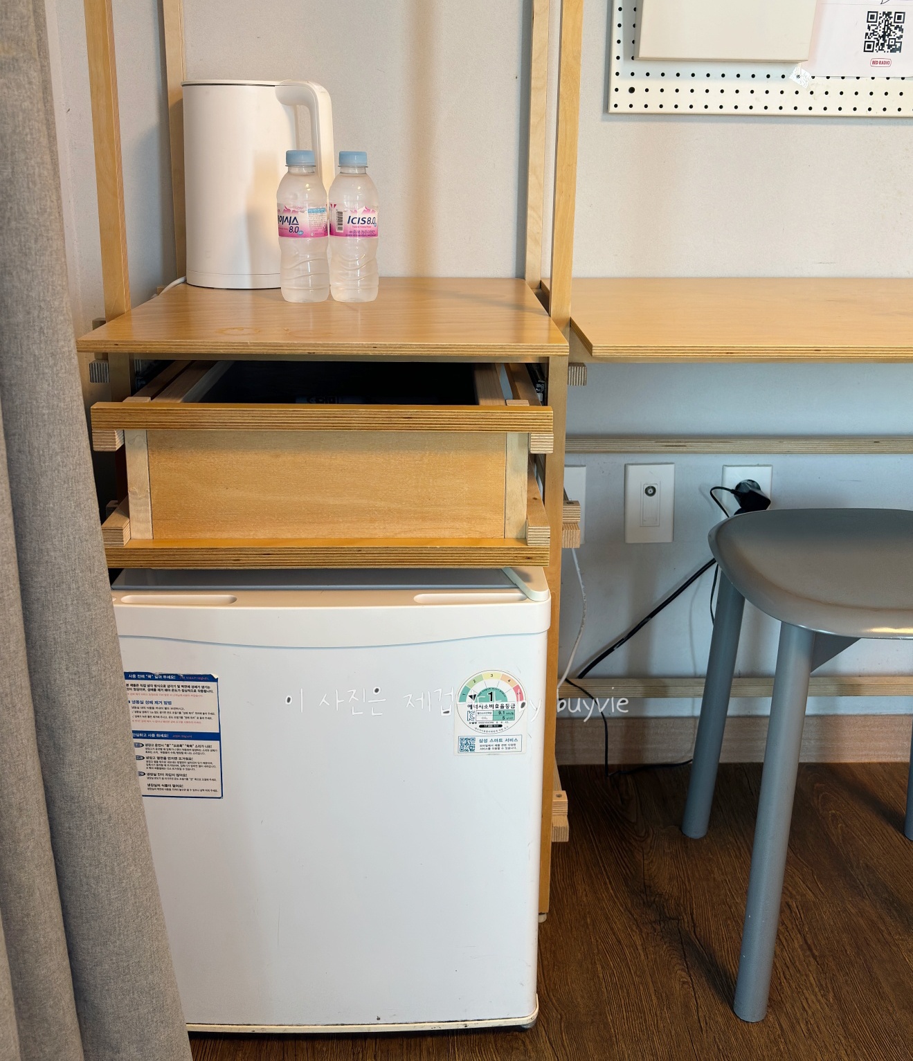 공용주방에는 식탁과 공용 냉장고, 정수기, 싱크대, 밥솥, 에어프라이어, 전자레인지 등이 있습니다. 장기투숙 하는 여행자나 동문시장에서 음식을 구매해 온 도미토리룸 투숙객에게 유용한 공간입니다. 밥솥 아래에 쌀푸대가 있는 것으로 보아 쌀은 무료로 제공하는 것 같았어요.