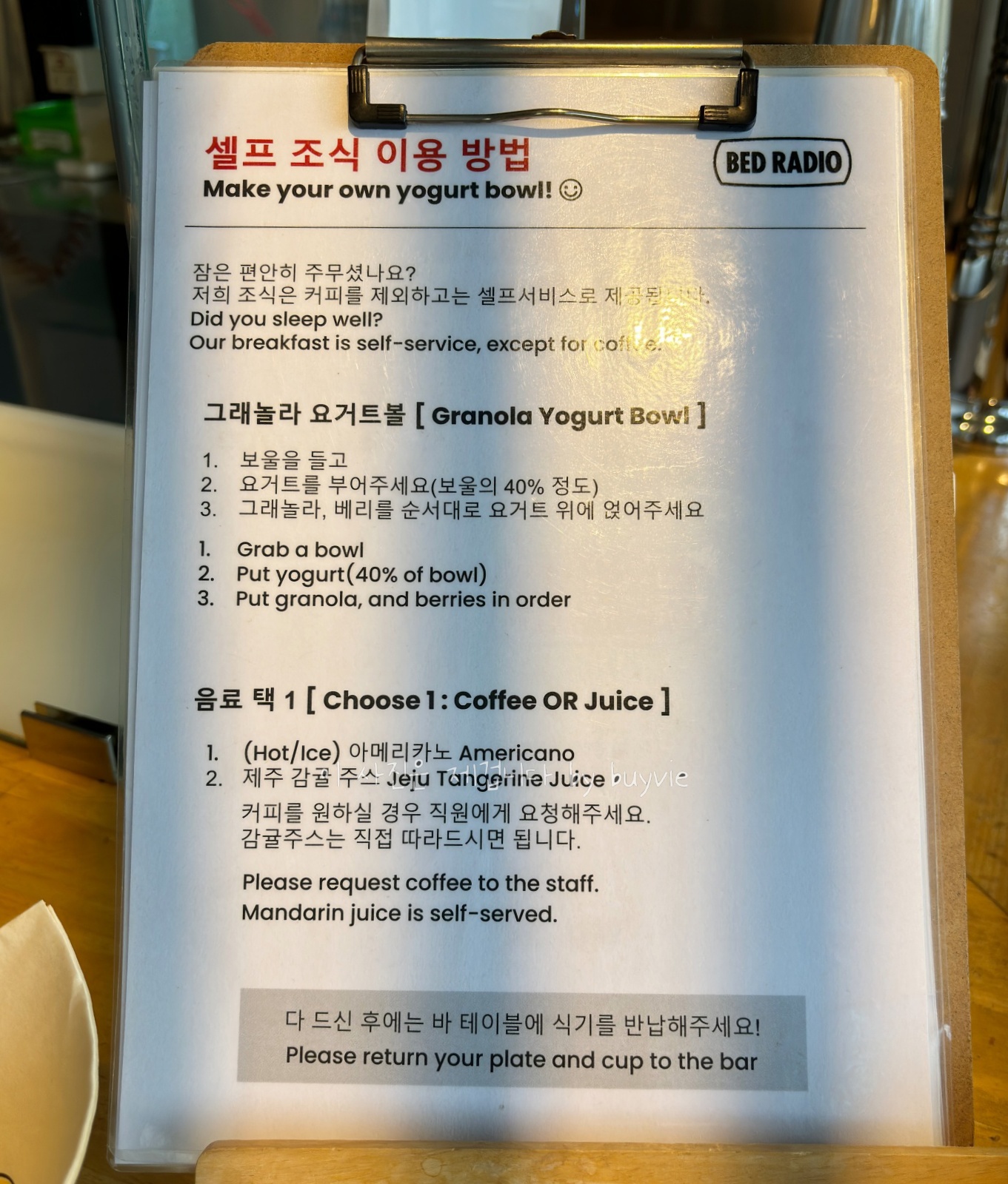 제주 요거트 + 제주 오트팩토리에서 만드는 그래놀라와 베리를 셀프 제조해 먹습니다. 여기에 아메리카노 또는 감귤주스를 선택할 수 있습니다. 아, 여기서 베드라디오 도두봉 점과 다른 점이 또 하나 있네요. 베드라디오 도두봉은 요거트볼 구성이 같지만 직원이 만들어 줍니다.