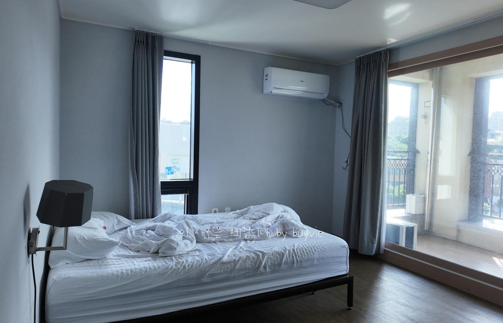 방에는 더블침대가 있어요. 보이는 것처럼 침대 발쪽으로 테라스가 있고, 뷰는 위,위 사진과 같습니다. 그런데 침대 옆으로도 좁은 창문이 있죠. 여기 뷰도 끝내줍니다. ↓