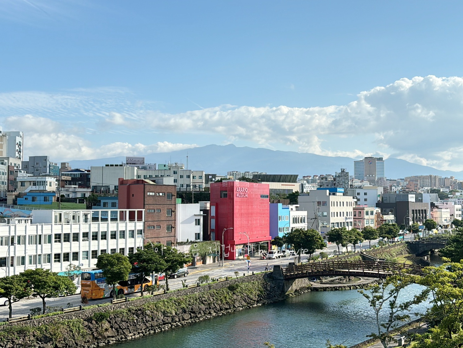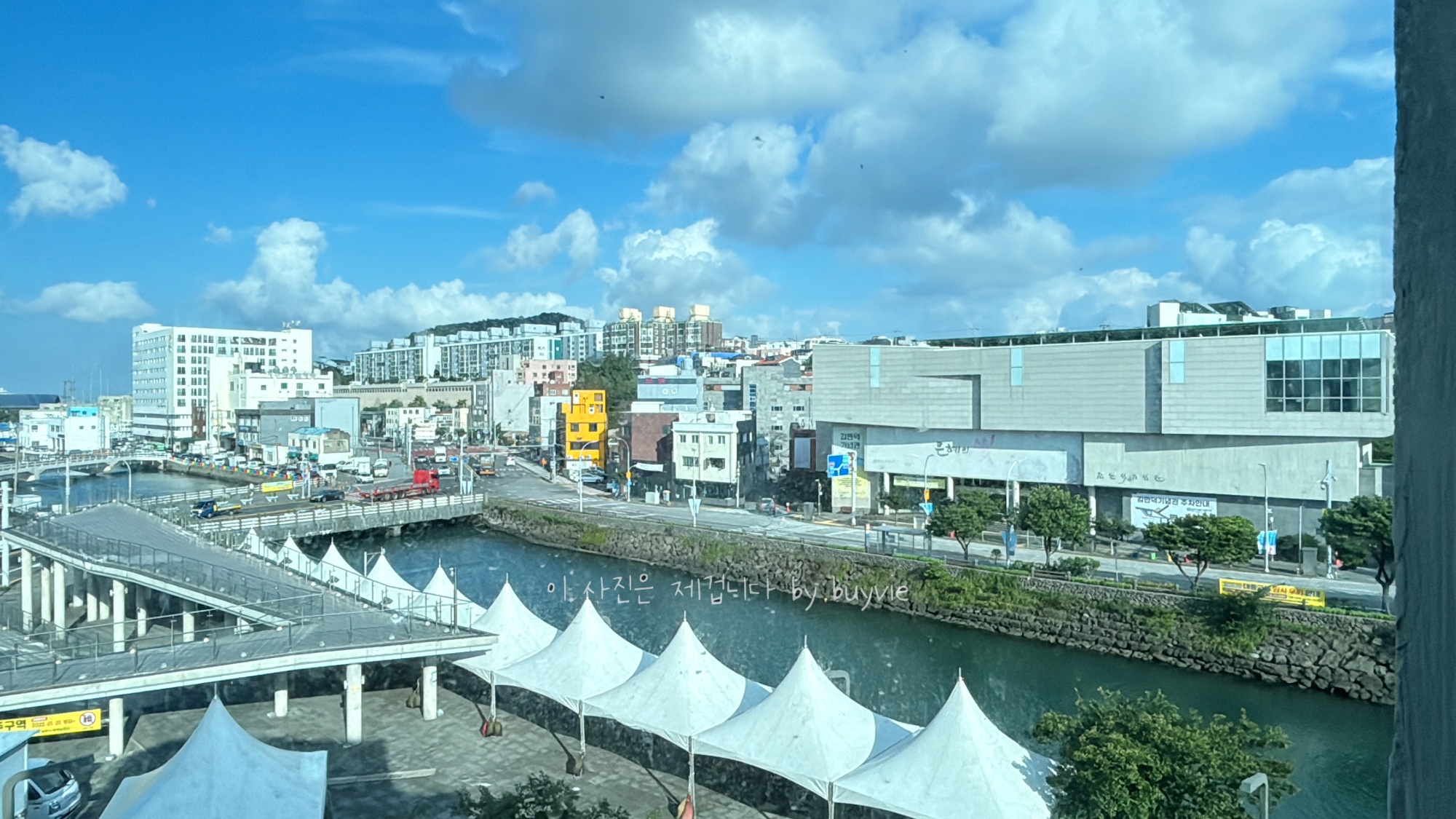 좁은 창문으로 보이는 산지천 모습입니다. 저 멀리 아파트 위로 사라봉이 살짝 걸쳐 보이네요. 산지천 건너편에 있는 건물은 김만덕기념관입니다.