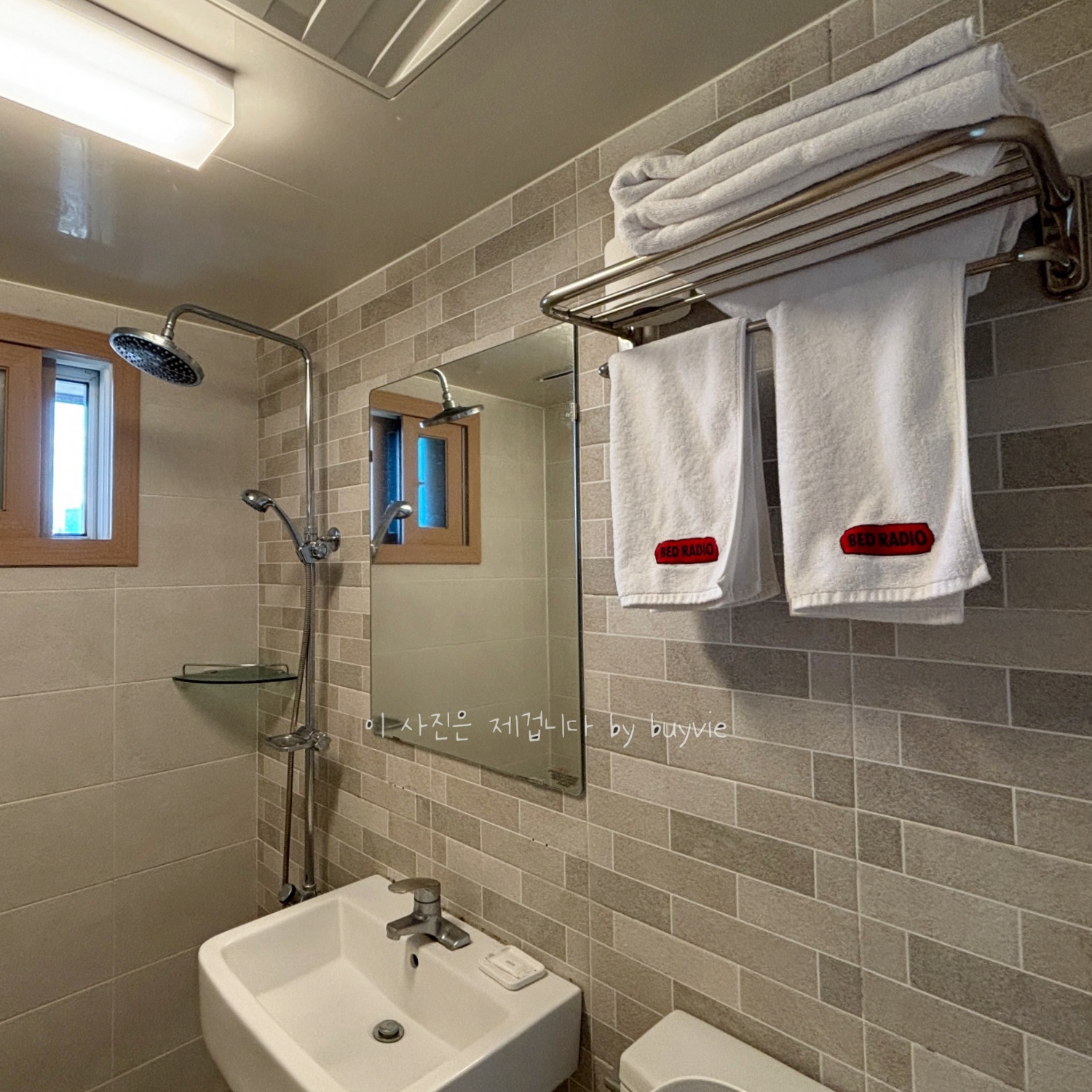 개인 욕실&화장실입니다. 베드라디오 로고가 수놓아진 작은수건2 + 큰수건2 제공됩니다. 세면기에 비누 하나, 샴푸, 샤워젤이 있습니다.