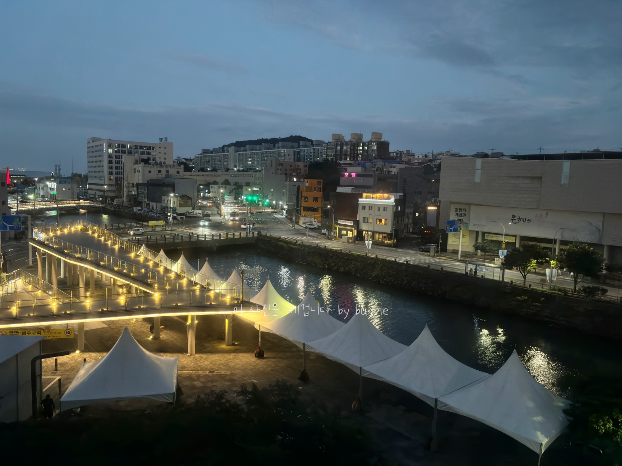 여긴 밤에 더 예뻐요. 불이 들어온 건 산지천 전망대 입니다. 제주에서 이렇게 불 밝힌 야경이 거의 없어요. 바닷가에 멀리 보이는 오징어배가 야경이라면 야경인데요, 그렇다보니 이렇게 불 들어오는 야경은 매운 드문 모습입니다.