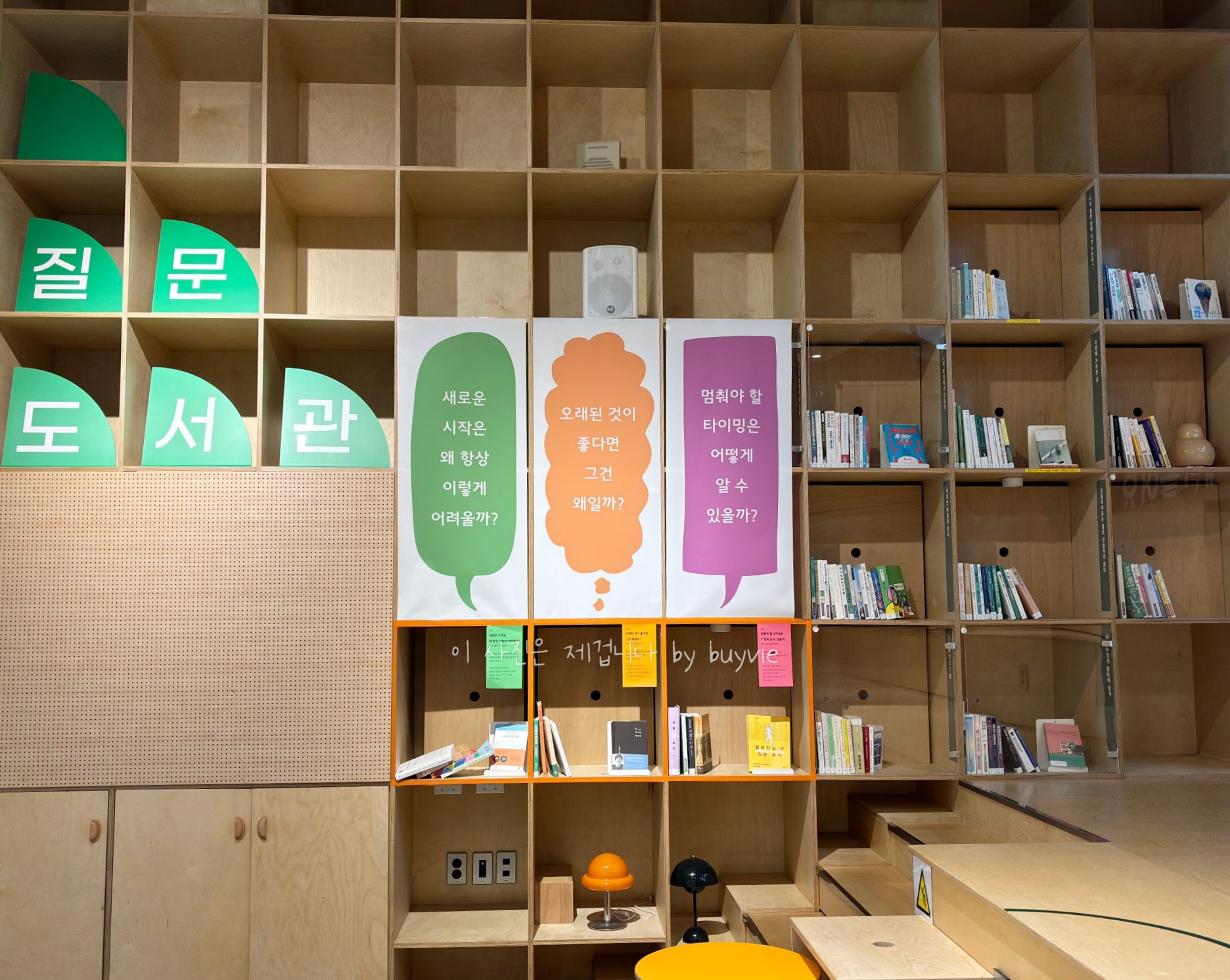 질문에 답을 주는 책이라니 북큐레이션에 엄청 공들인 듯하다. 여기서 자유롭게 책을 뽑아 읽고 제자리에 돌려놓으면 된다.