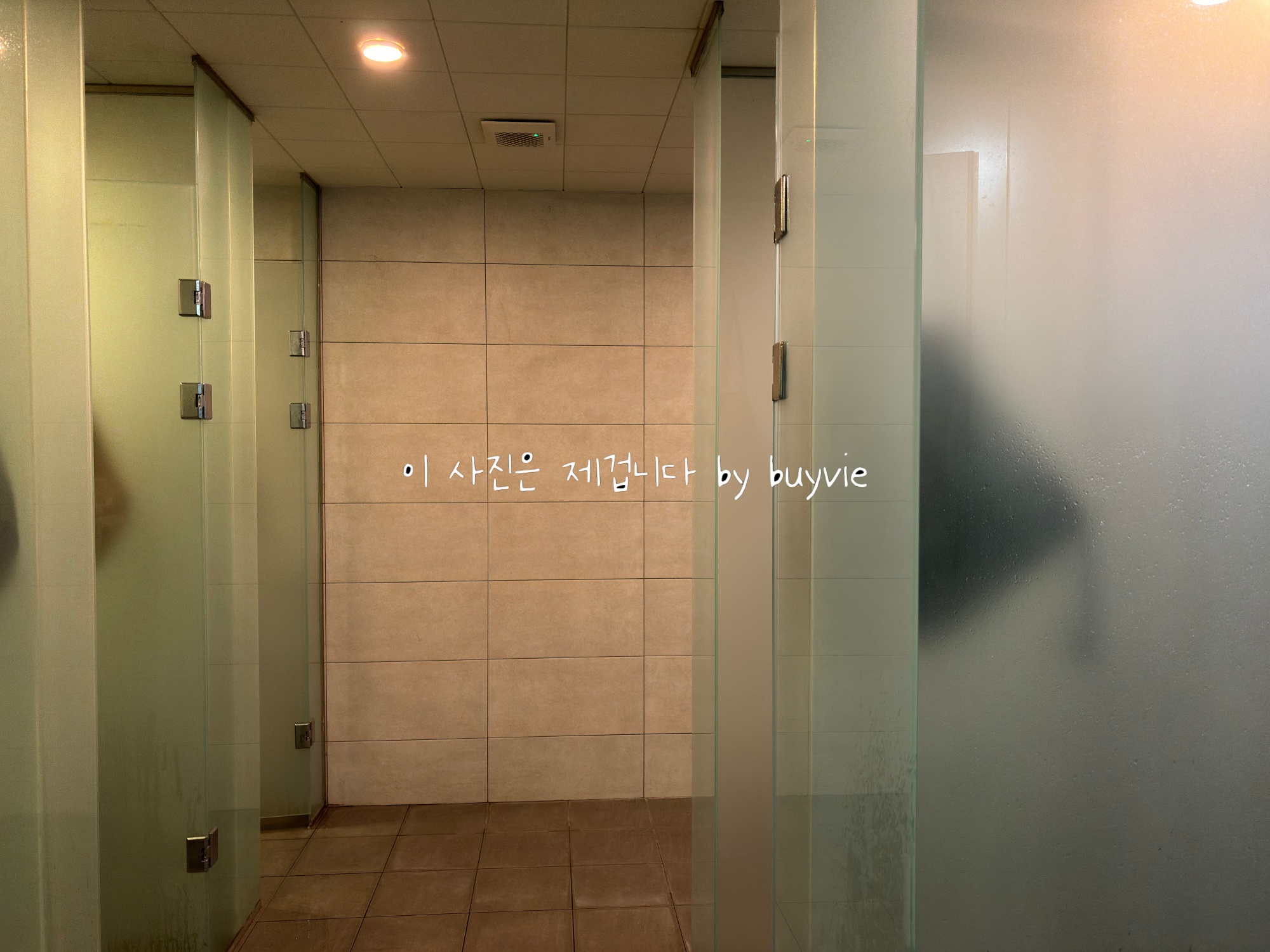 2층에는 샤워실이 있고 7개의 샤워부스가 있다. 샤워 공간이 넉넉한 편이다. 내부에는 샴푸, 린스, 바디워시가 준비되어 있고, 샤워하는 동안 소지품을 보관하도록 큰 가방이 하나씩 걸려있다. 샤워부스 바깥으로 드라이기, 거울 같은 그니까 목욕탕 같은 고러한 분위기의 파우더 공간이 있다. 반대편으로 화장실과 세면대가 있고 커튼으로 분리되어 있다.