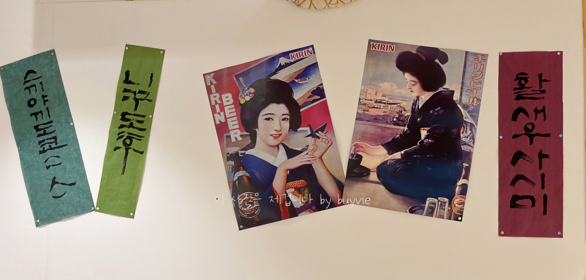 빈티지한 기린 맥주 포스터 양 옆으로 '스키야키 도쿄' 메뉴가 보인다. ㅎㅎ.. 나 이거 먹으러 왔숑. 1인분 되는 스키야키 너무 반갑다.