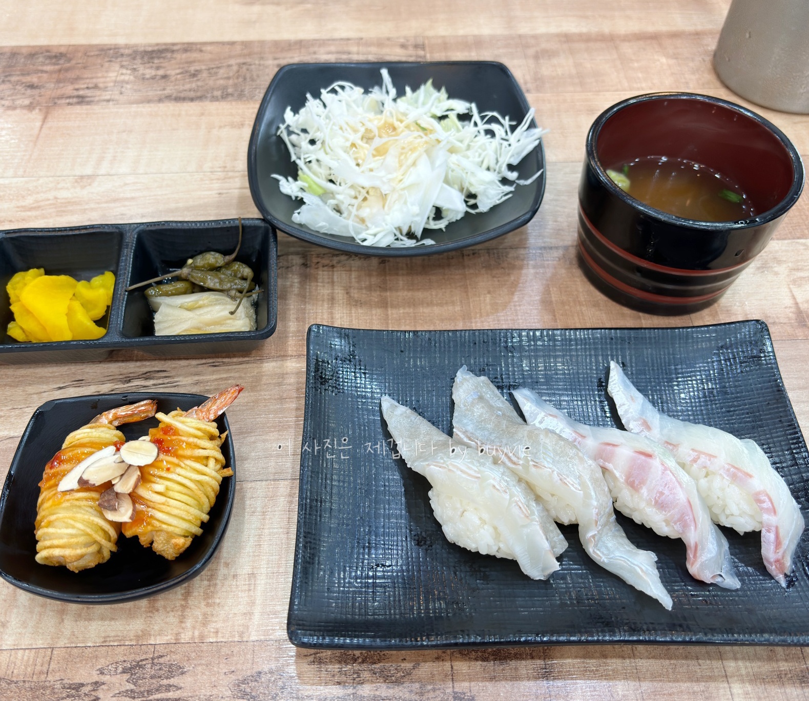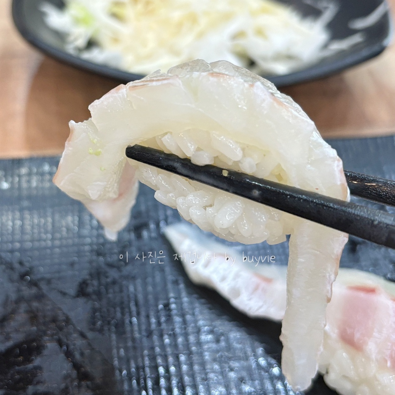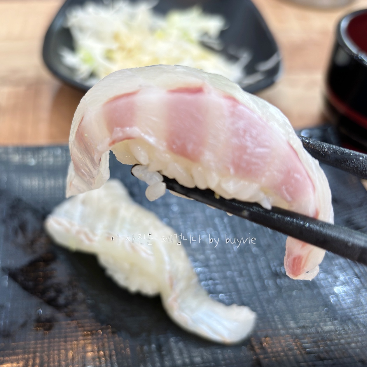 사실 위장에 탈이 나서 조심하던 중이었다. 그래도 초밥 두가지는 먹어야 겠다. 최대한 기름진 도로대신 도미뱃살과 광어지느러미를 주문하고, 새우 감자말이도 주문했다.  꼭꼭 씹어먹을게. 줄 안 서고 바로 입장할 수 있는 날이 또 언제 올 지 모르니까 일단 먹기로.