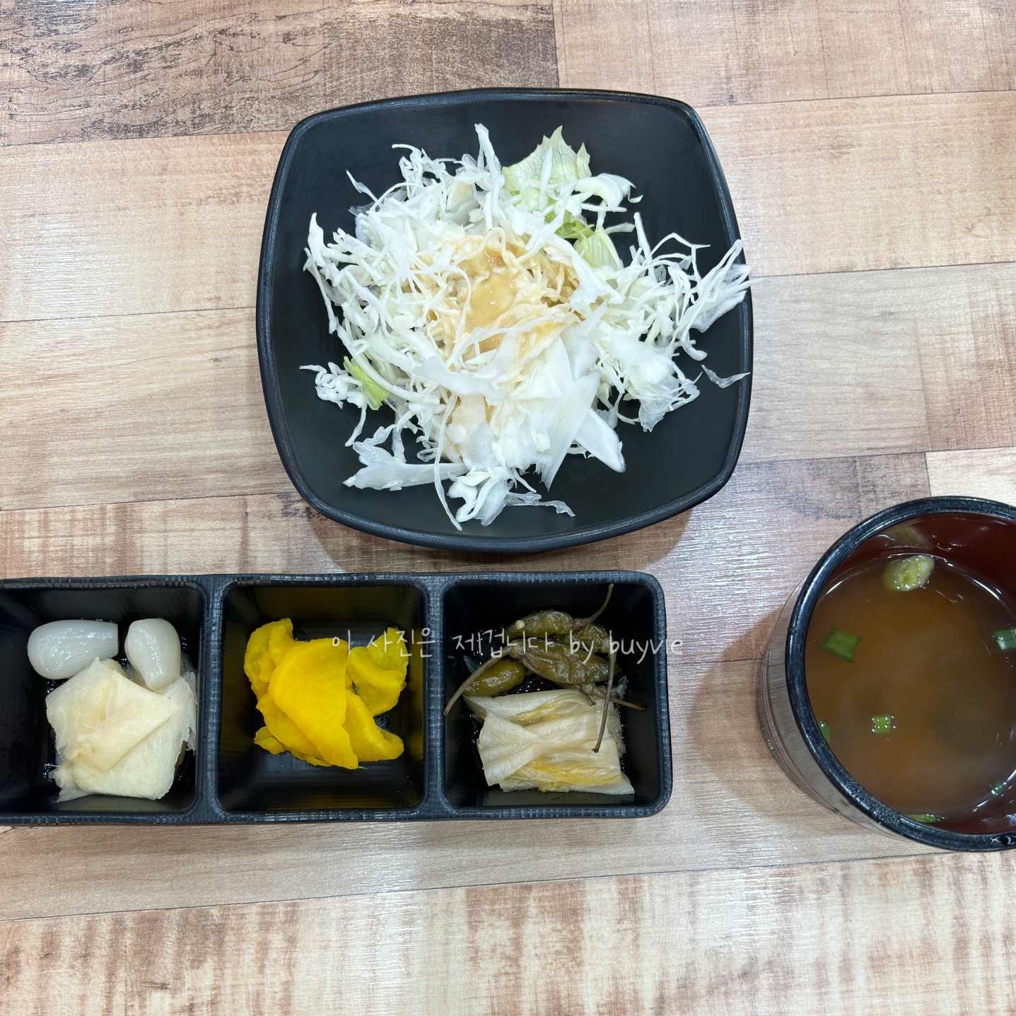 기본적으로 양배추 샐러드와 초생강, 락교, 단무지, 백김치 등 자잘한 반찬과 된장국이 나온다. 처음엔 가져다 주고 부족하면 셀프바에서 가져다 먹으면 된다.