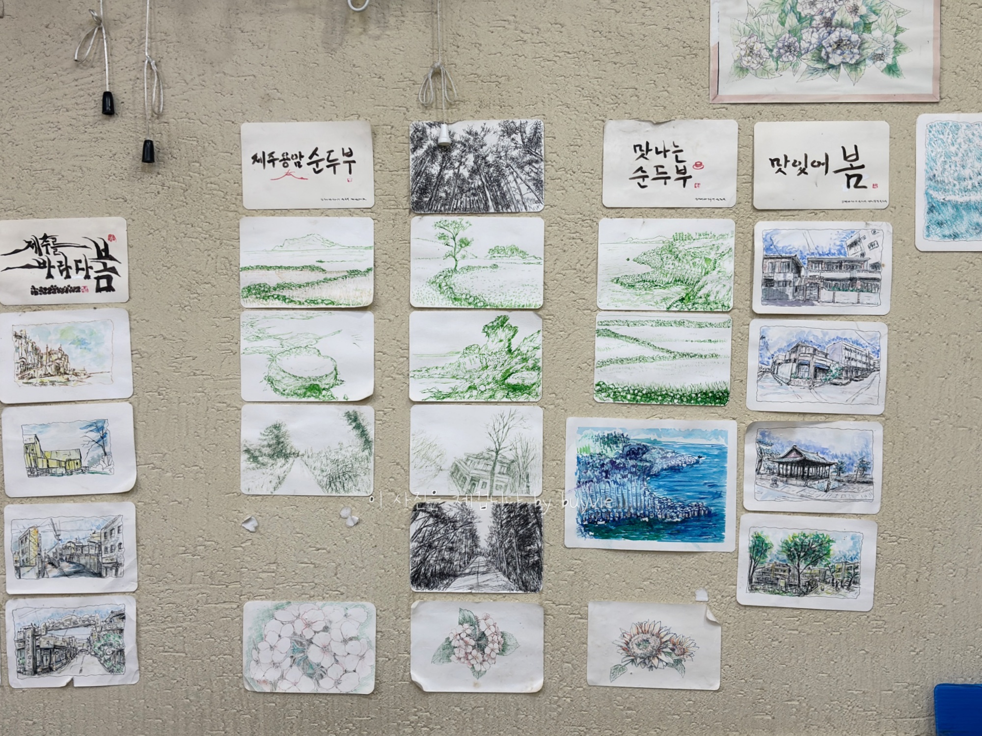 이 집과 관련된 누군가인 듯... 자식일 수도 조카일 수도 알바생일수도.. 여튼 누군가가 용담동 주변과 관광지를 그려 놓았다. 성산일출봉, 용두암, 관덕정, 주상절리... 저 집은 사장님 집인가?