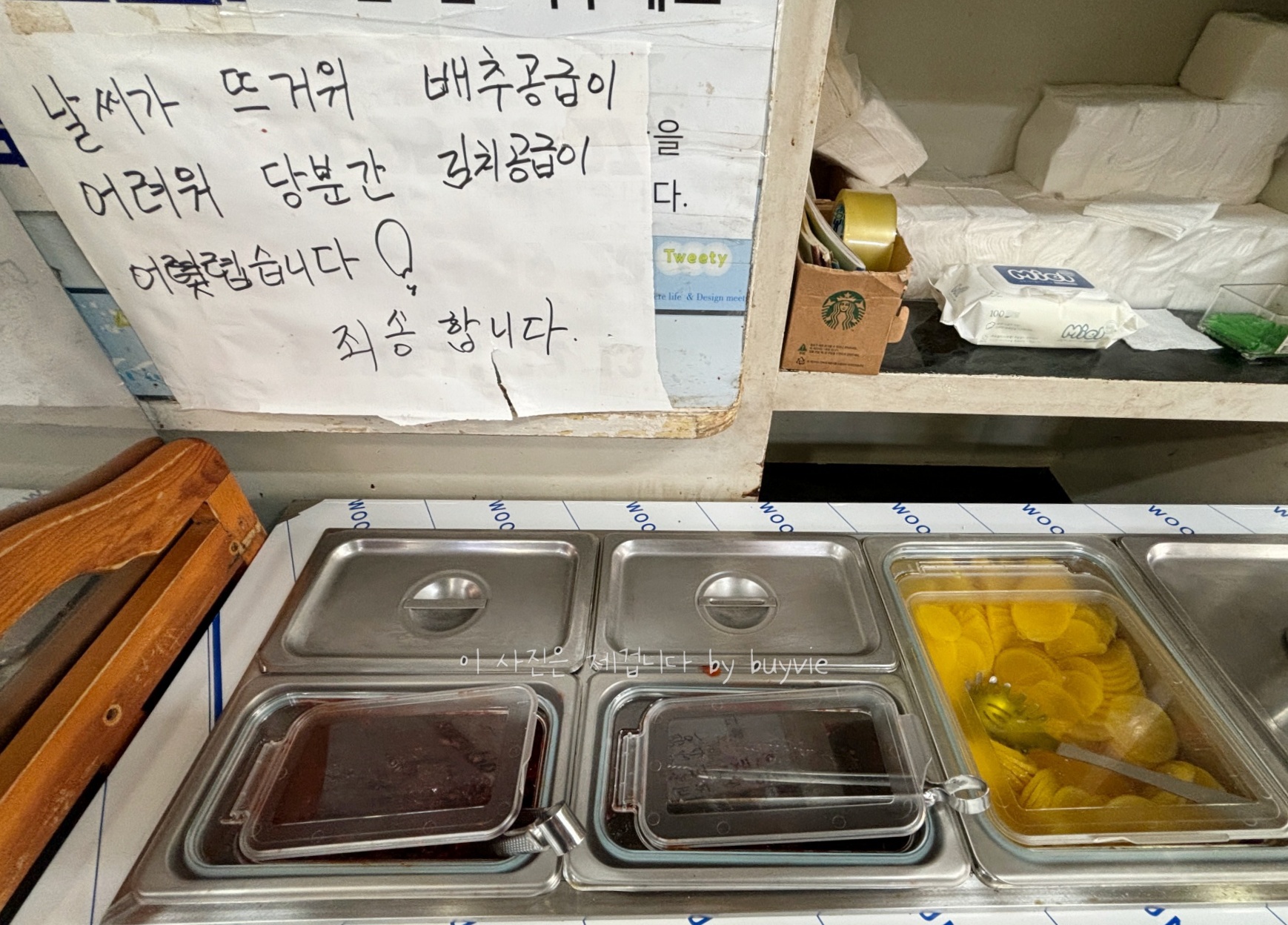 음식값을 꾸준히 올리시는 것에 비해 항상 앓는 소리를 하신다. 어쩔 때는 오징어값이 비싸다 써 있고, 이번에는 배추 공급이 어렵다고 하심.. ㅎ.. 셀프바에서 사람들이 너무 가져가서 버리게 되는 걸 경고하는 차원이라 생각한다. 달력 뒤에 틀린 글씨도 터프하게 찍찍.... 종이도 아끼시네.. ㅎㅎ.