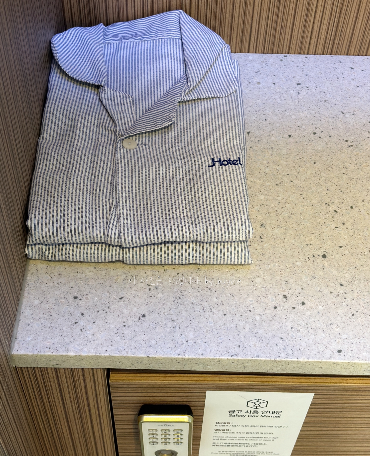 커피2, 녹차2, 전기주전자 아랫쪽에 미니 냉장고가 있고 생수 두병이 들어 있다. 공간 구성은 클래식한데 가운이 아닌 잠옷이 있다. 일본식 호텔에서 볼 수 있는 서비스, 요즘은 잠옷으로 가는 추세인 듯 하다.