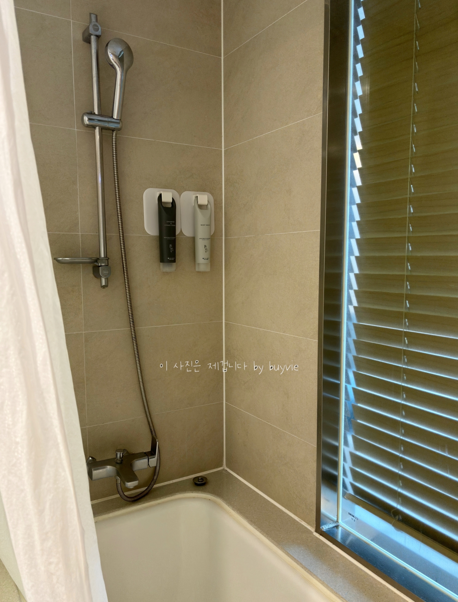 욕실에는 욕조가 있다. 핸드워시, 샴푸, 바디워시가 있고 콘디셔너, 치약, 칫솔은 없다.