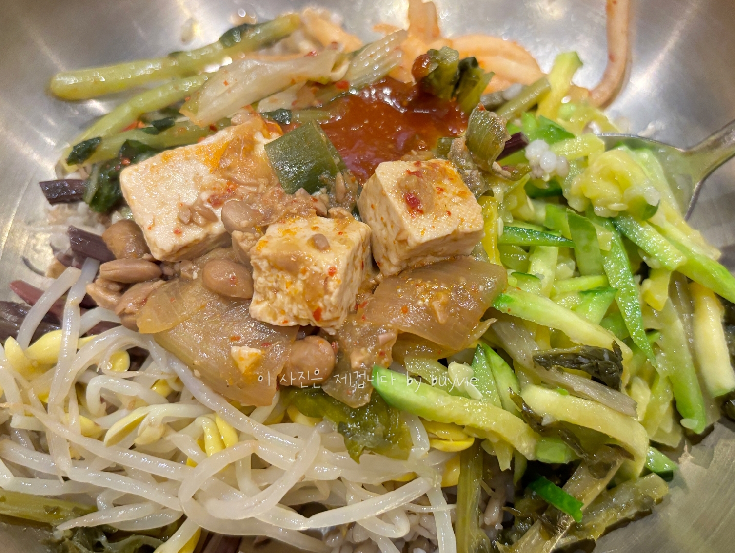 나물도 집에서 먹으려면 손품이 많이 드는 음식이잖아. 청국장도 딱 비벼먹을 만큼 나오는 실속형이다. 나물 부족할 경우 요청하면 바로 가져다 주신다. 우린 콩나물과 애호박을 추가해 먹었다.