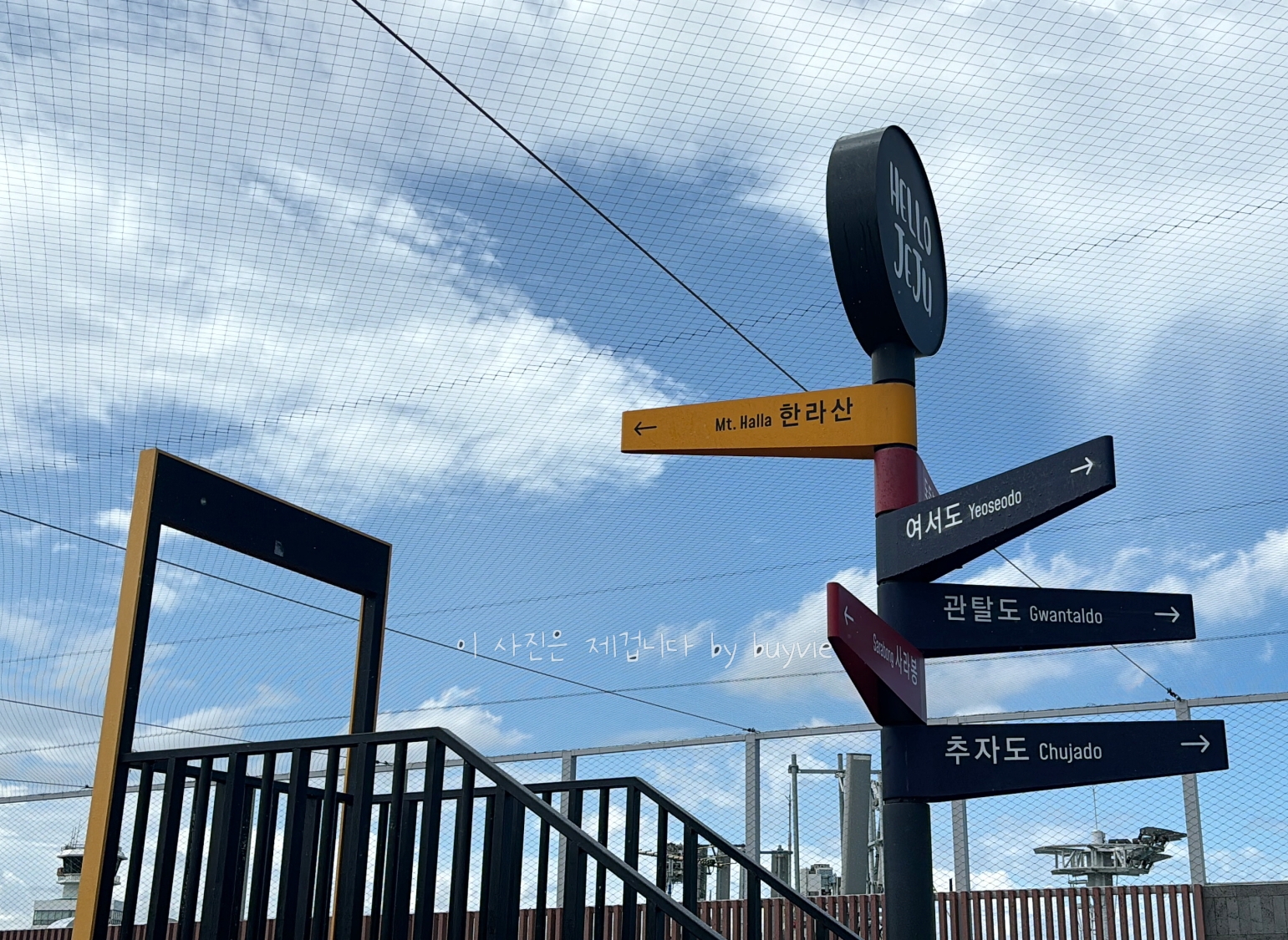 제주 공항전망대에서 가장 눈에 띄는 건 방향 표시와 계단이다. 계단에 올라가면 한라산이 보인다고 하여 한라산 조망 존이다. 내가 갔을 때는 한라산쪽이 구름에 휩싸여 있어서 올라가 보진 않았다. 곧이어 비가 떨어지기 시작했다. 그런데 하늘이 너무 맑고 이쁘다. 제주날씨는 종잡을 수가 없다.