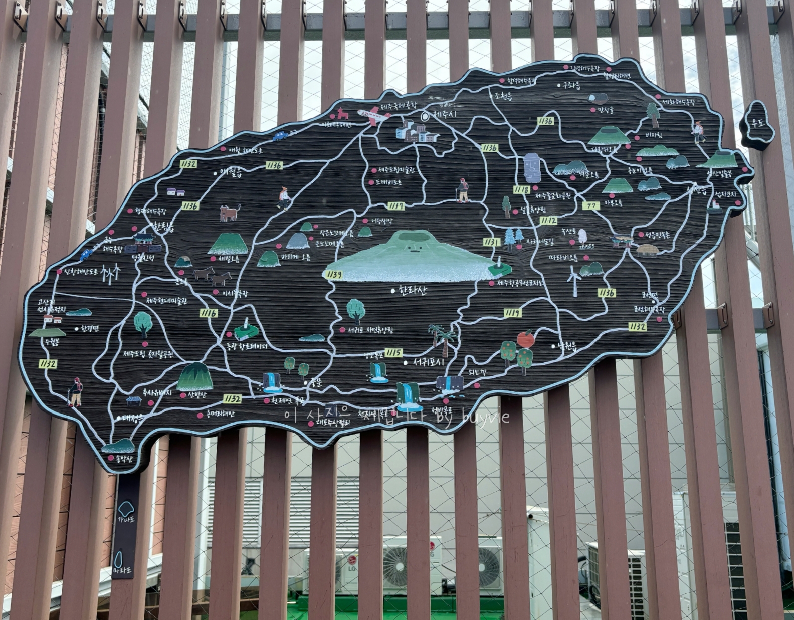 전망대로 나가면 가장 먼저 제주 지도가 있다. 여기에 주요 여행지를 확인할 수 있다. 주로 전통의 관광지이다... 음... 안 가본 곳이.. 두군데 있네... 갑자기 도장깨기 욕구가...다음 여행에서 바리메오름과 명월산성에 가봐야 겠구먼.