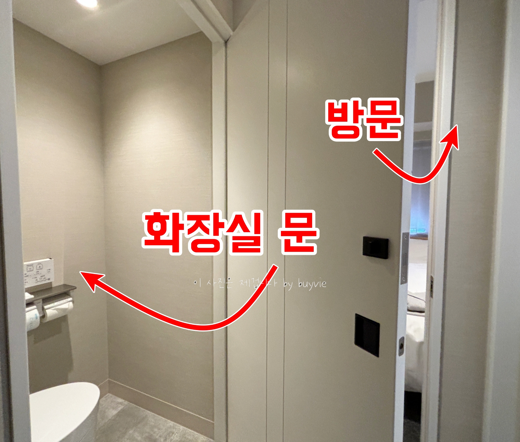 방에서 재밌는 걸 발견했다. 화장실문이다. 화장실 쪽으로 닫으면 화장실문인데, 이걸 방쪽으로 열면 방을 닫는 중문이 된다. 공간활용 아이디어 너무 좋다. 다만 방에서 문을 잠글 수는 없다.