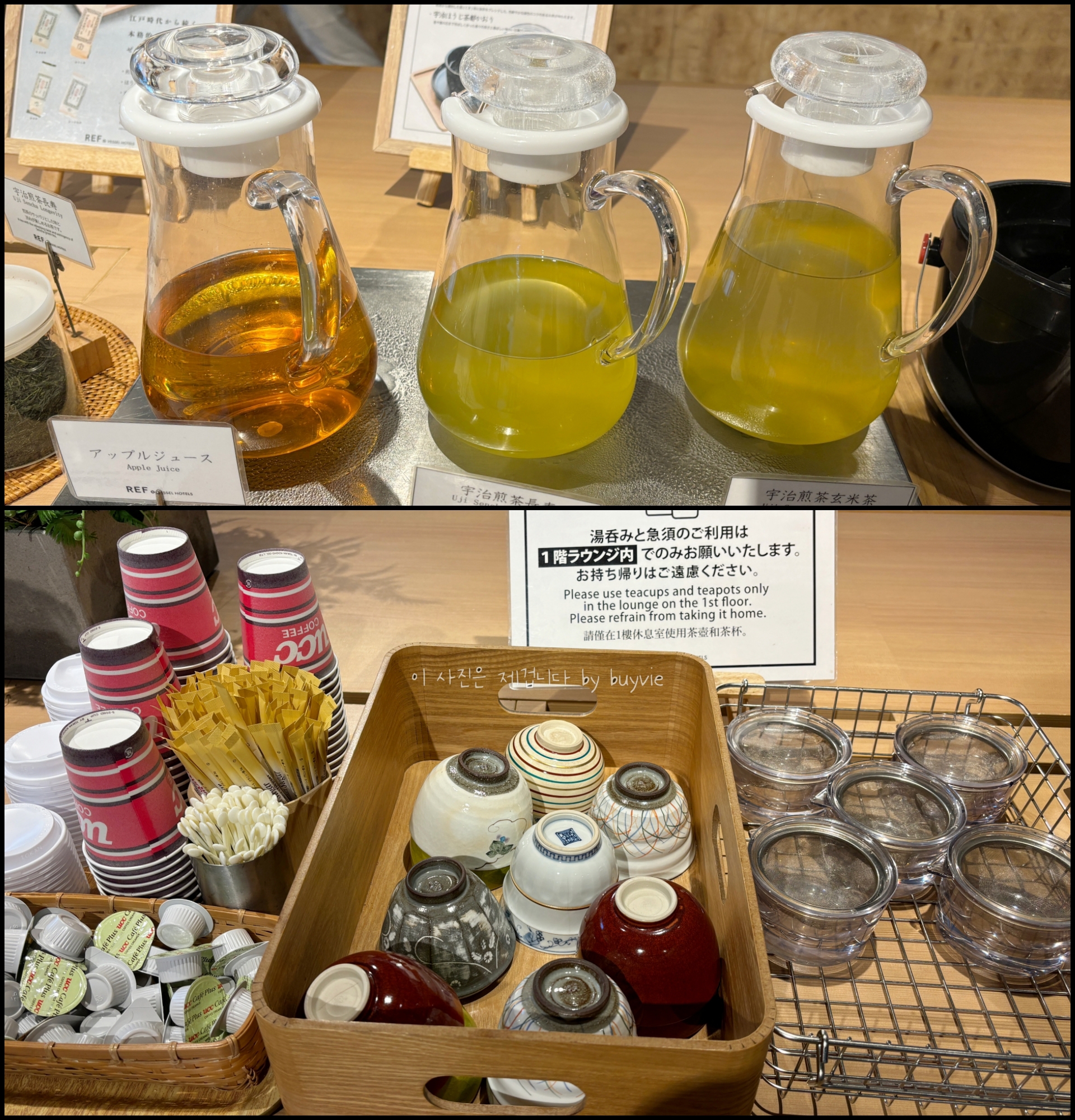 사과주스, 말차 두가지, 커피, 잎차와 다기.. 원하는대로 셀프 드링크하면된다. 잎차도 3가지가 준비되어 있다.