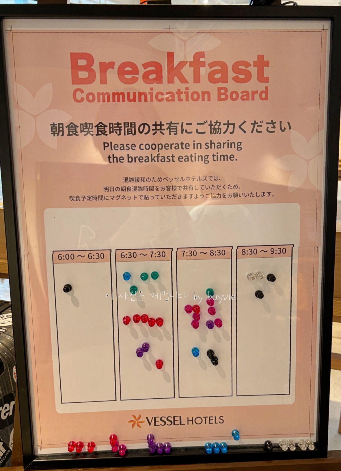 마침내 훌륭한 조식을 소개한다. 난 조식포함으로 예약하여서 추가 비용을 결제하지 않았는데, 체크인 할 때 별도로 조식 예약 할 수 있다. 1,400앤이다. 1층 프론트데스크 앞, 조식당 입구에는 이런 게시판이 있다. 붐비는 시간을 예측할 수 있다. 너무 좋은 아이디어이다. 이때부터 이 집 좀 디테일하구나.. 생각하고 있었다.
