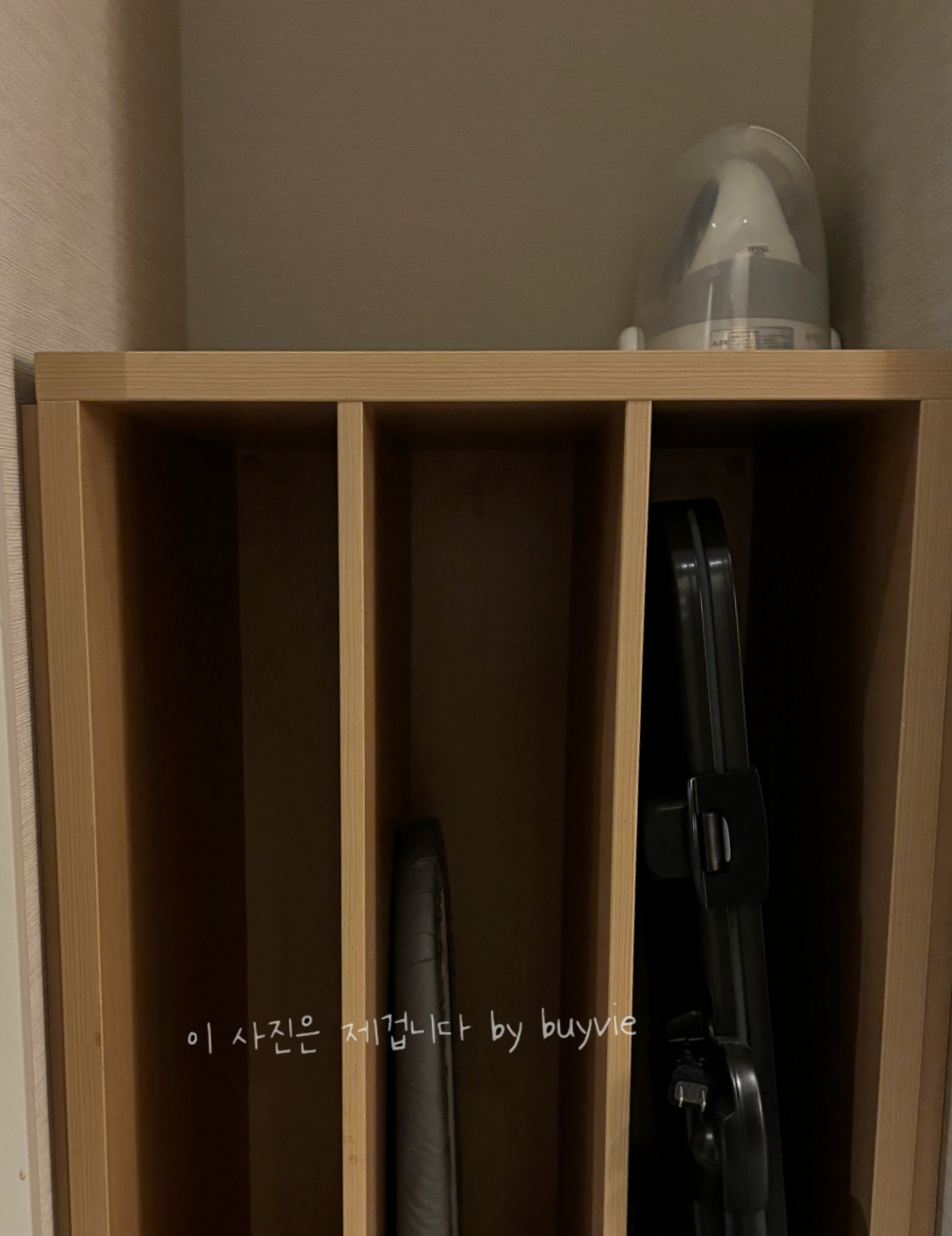 세면기 쪽으로는 서랍이 있는데 여기 대략 주전자, 컵 등 들어 있고, (아래 사진) 그 아래 냉장고가 있다. 그리고 옷걸이와 함께 섬유탈취제가 있는데 요게 퀄러티가 좋았다.