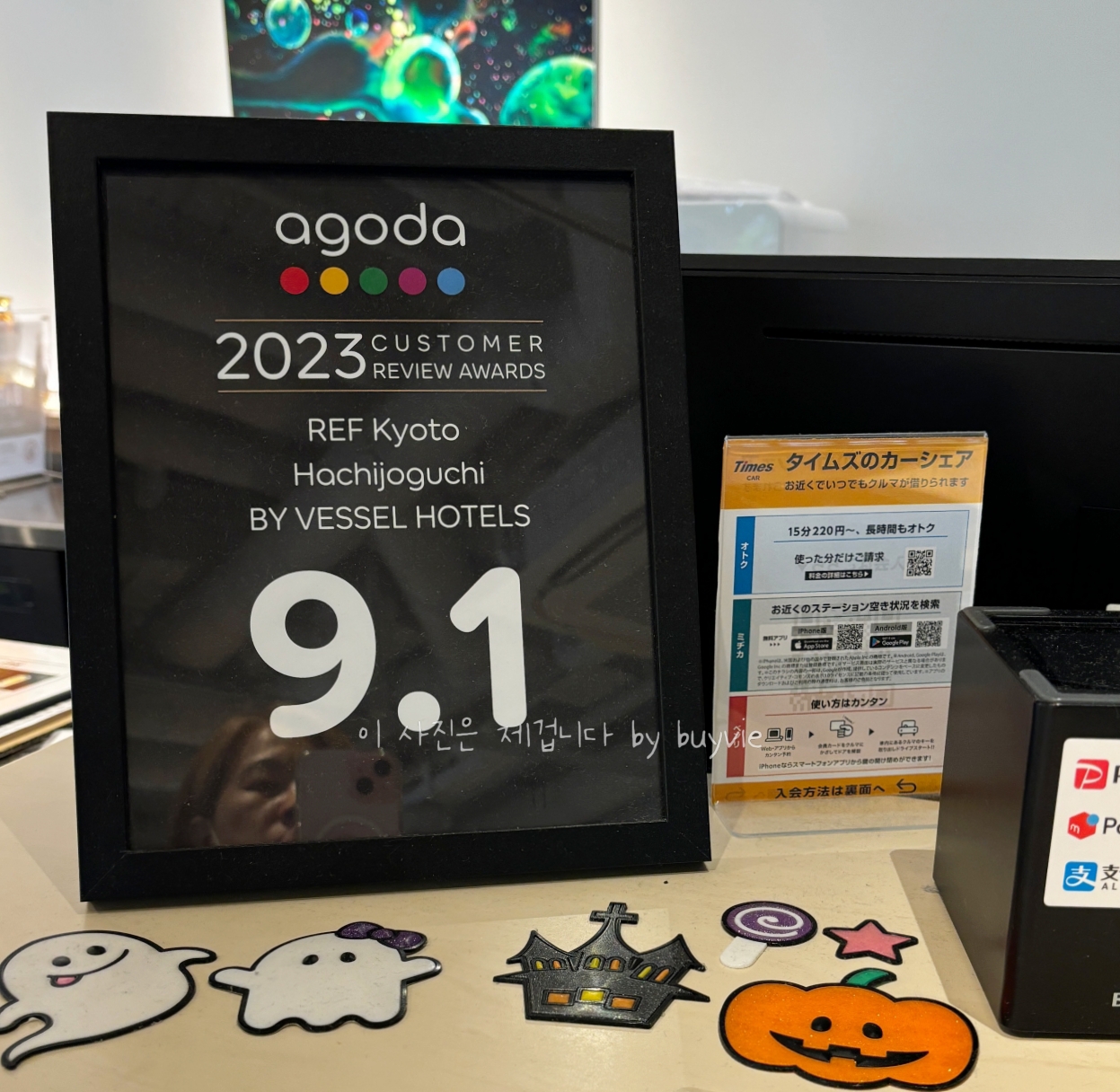프론트데스크는 1층에 있다. 데스크에 아고다 평점 9.1이 눈에 들어온다.