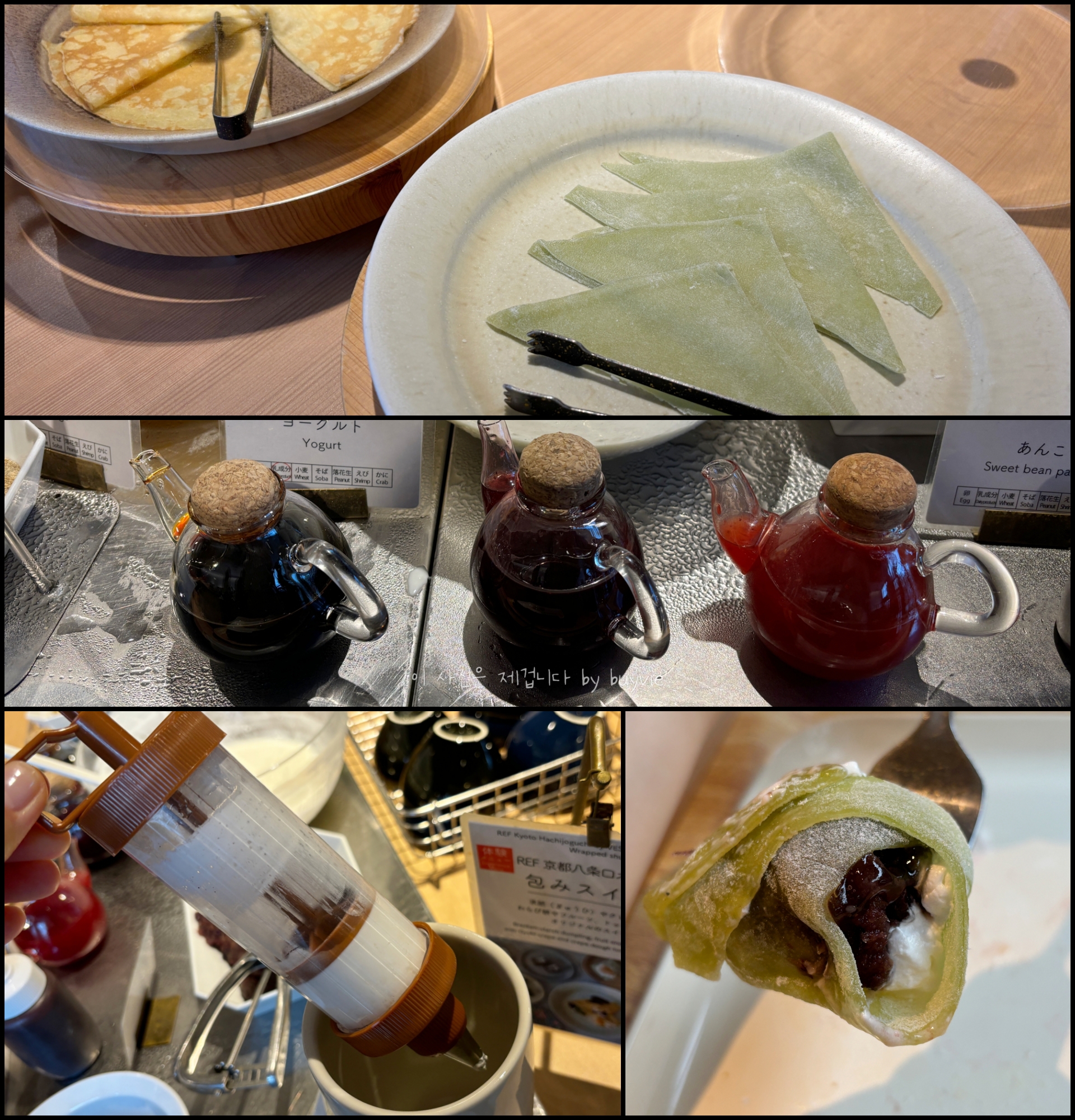 과일청, 시럽 종류도 귀여운 팟에 담고, 생크림은 주사기에 담아 얼음으로 받쳐 놓았다. 소꿉장난하는 것 같은데 싫지가 않아. 위 사진에 보는 것처럼 팬케이크가 두종류처럼 보이지만 하나는 팬케이크이고 하나는 떡이다. 앙이 준비되어 있어 떡으로 말아 먹을 수 있다.