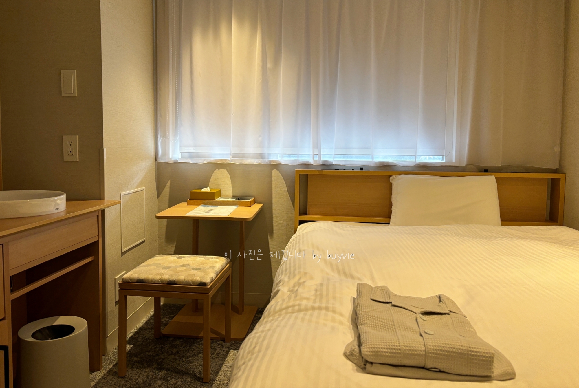 세면대가 건식이다. 많은 일본호텔, 일본식호텔, 공간활용을 컴팩트하게 하는 곳들이 건식 세면기를 쓴다. 개인 취향상 물이 좀 튀긴 하지만 전체적으로 만족도가 높아서 이것마저 이뻐보인다. 별도로 작은 테이블이 있어서 편의점 털이 음식을 먹을 수 있다. ㅎ..