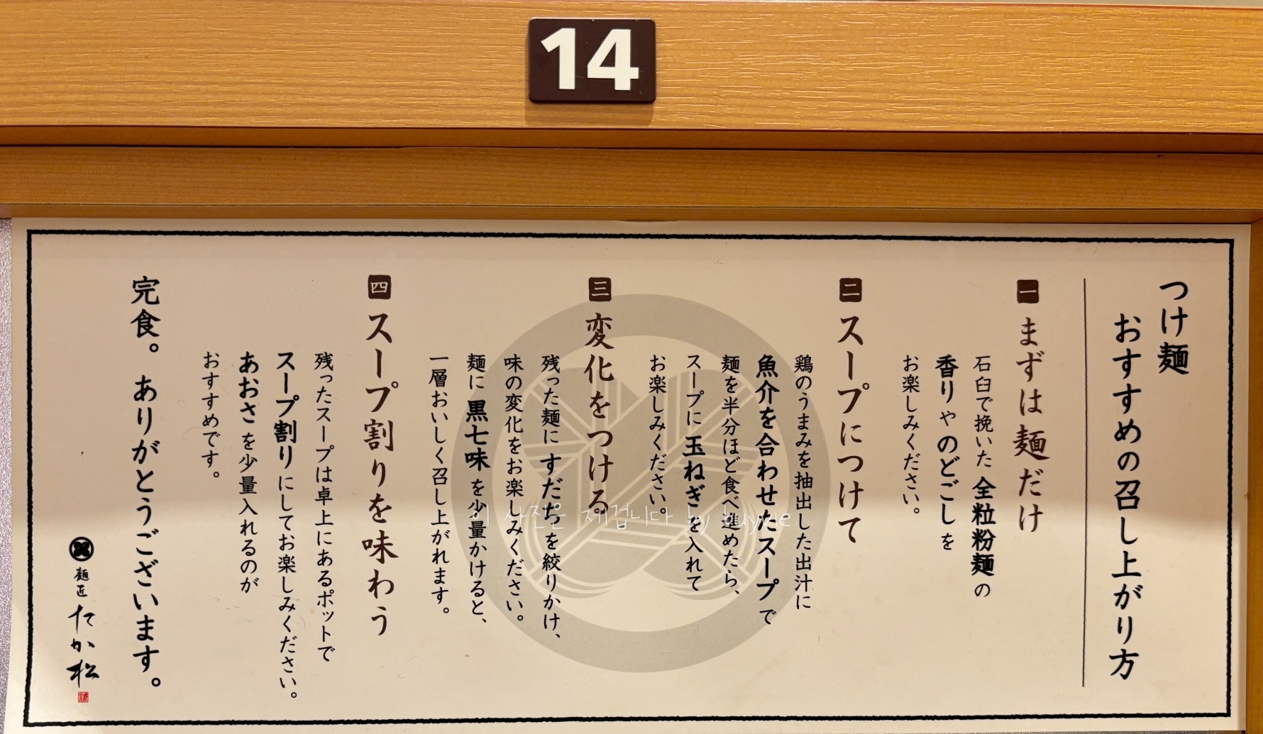마침내 내 차례가 되어 들어갔다. 나를 위해 준비된 다찌테이블에는 전면에 먹는 방법이 있고, 물과 젓가락 등등이 준비되어 있다.