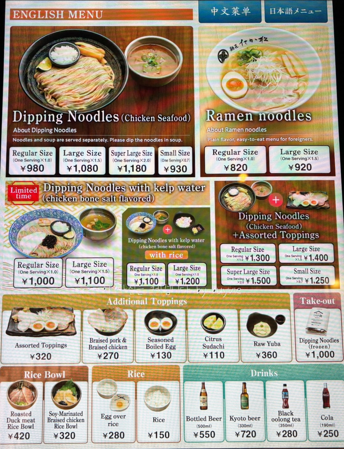 메뉴는 그림만 봐도 다 개성이 넘친다. 거의 모든 집들이 줄 서는 맛집으로 집집마다 줄 서는 방향이 질서정연하게 정리되어 있고, 교토역에 도착하거나 떠나기 직전 이용하는 사람들도 많아서 트렁크 공간을 따로 두는 집들도 있다.