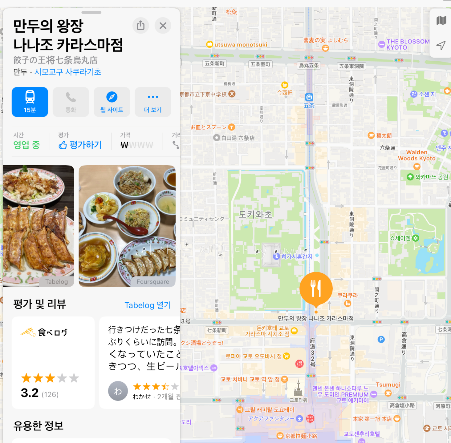 애플지도는 '만두의 왕장 나나조카라스마점'이라 나와 있다. 이후 아무리 나나조 카라스마를 찾으려고 해도 찾아지지 않았다. 애플지도는 가끔 번역을 이상하게 하는 경향이 있어. 제주도를 '한려도?' 거 뭔 뜻이여? 여튼 만두집 앞 히가시혼간지는 이전에 가 본 기억이 있어 구글지도로 히가시혼간지를 찍고 갔다. 생각해 보니 지난 여행 때 내가 궁금해 했던 중국집이다.