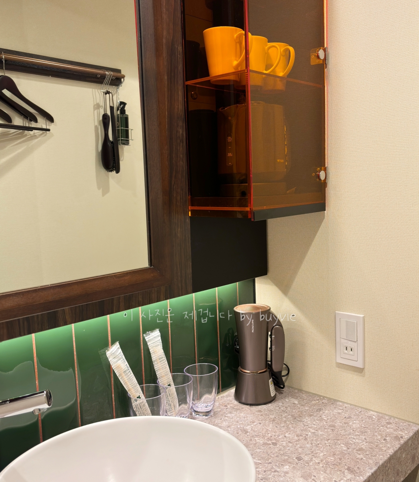 방마다 조금씩 구조가 다른데, 세면대는 건식이다. 드라이어기가 있고, 칫솔과 치약이 있다. 여기는 3명까지 머물수 있게 되어 있는지 머그컵 3개가 있네. 무선주전자와 얼음 주전자가 있고 반대편 옷걸이, 옷솔, 섬유향수, 구두주걱 등이 있다.