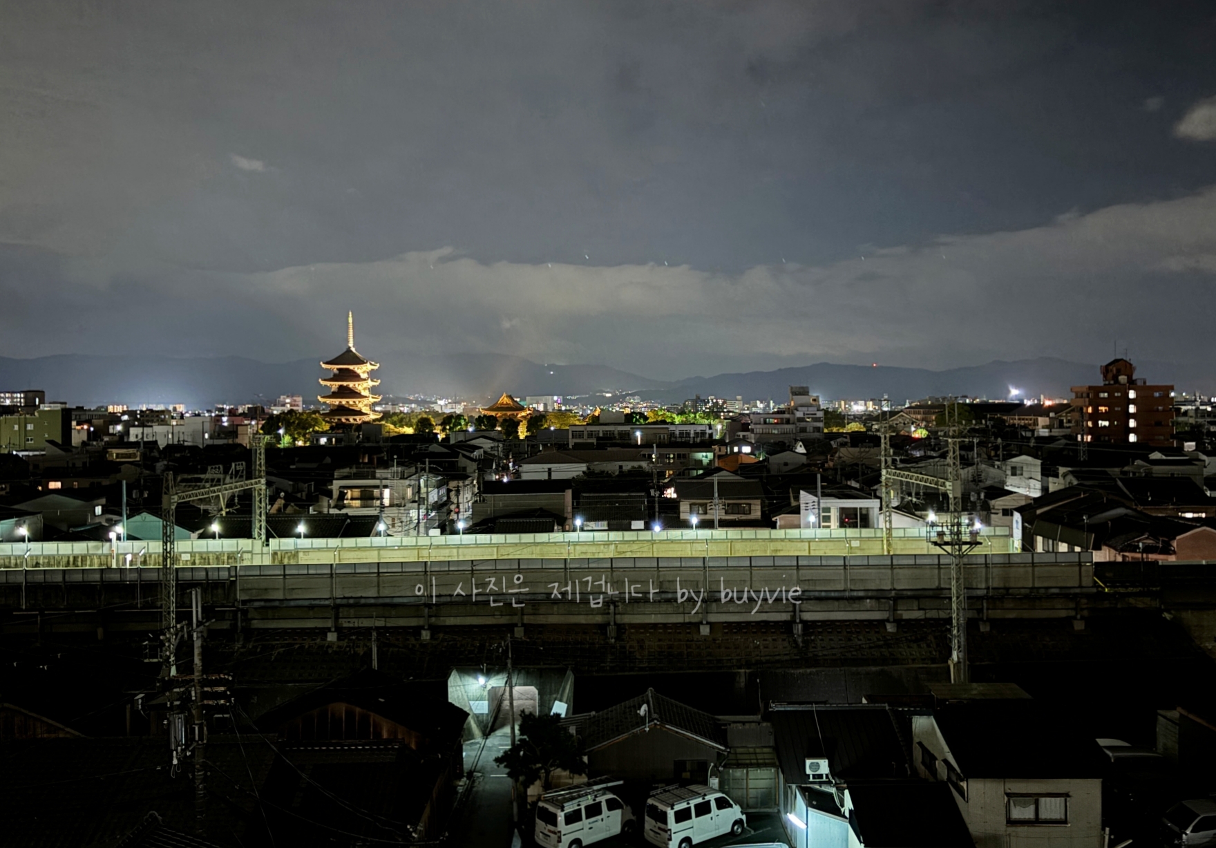 나는 운이 좋아서 6층 토지(동사)가 보이는 객실을 배정받았다. 방충망 없고 창문을 활짝 열수 없게 되어 있어서 창문틈으로 본 풍경이다. 기찻길 너머로 토지의 5층 목탑이 보인다. 일본에서 가장 높은 목조탑이라고 한다. 그리고 기찻길로 기차가 왔다, 갔다... 기찻길 아래로 사람도 지난다. 왜 이 멋진 풍경을 창문틈으로 보게 했을까? 반전은 내일 아침에.
