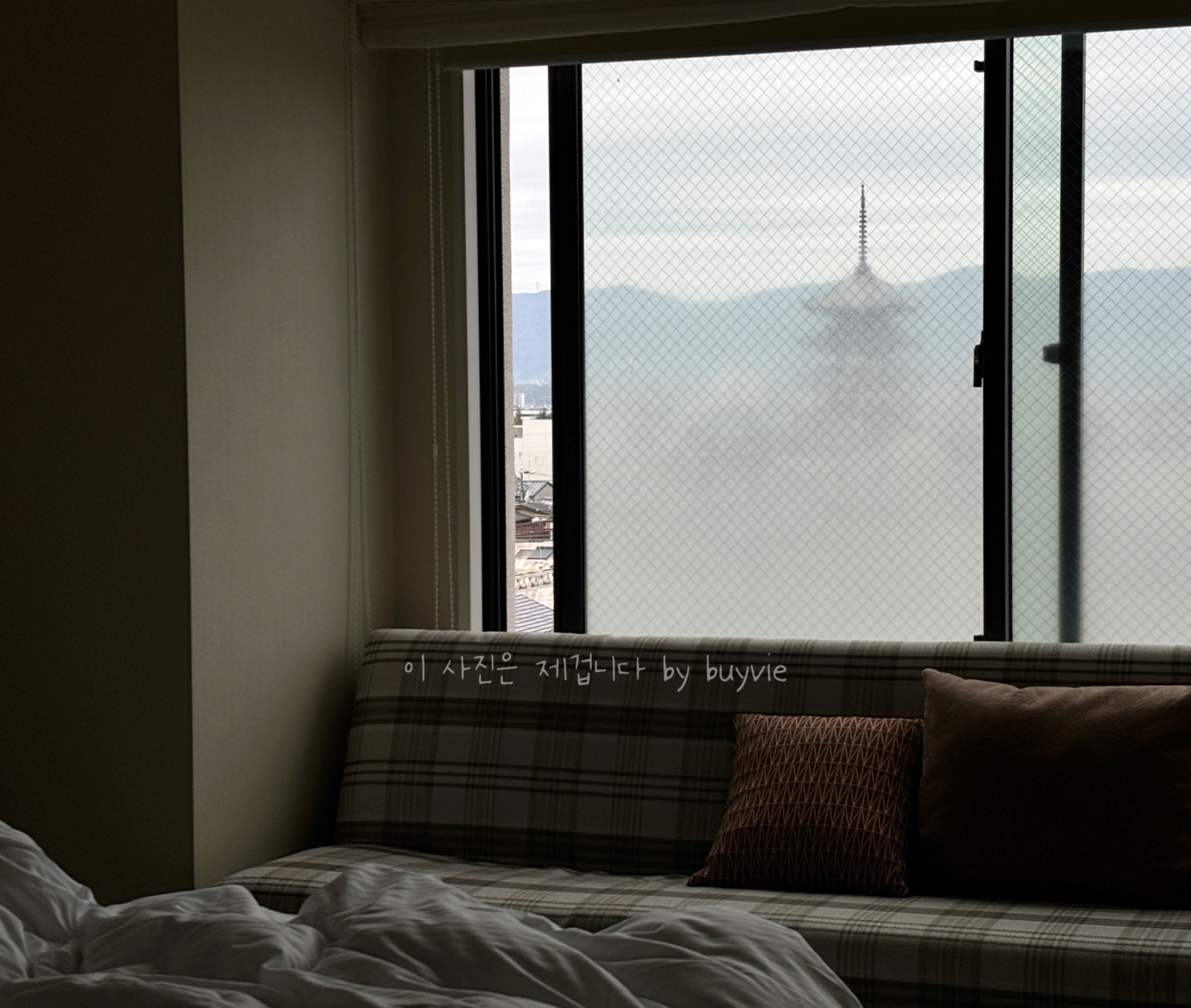 아침에 본 창문의 모습이다. 아랫부분은 반투명으로 코팅이 되어 있는데 저 창문이 마법의 창문인 듯... 실제 창가로 가서 보는 것보다 탑이 크게 보인다. 너무 신기해서 왔다갔다를 몇 번 했네.
