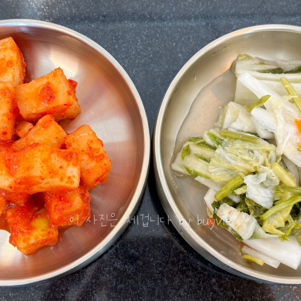 음식을 기다리는 동안 반찬이 나왔다. 깍두기와 백김치, 그렇지! 이게 북한식이지. 심플하고 담백한 서타일. 군더더기가 없다.