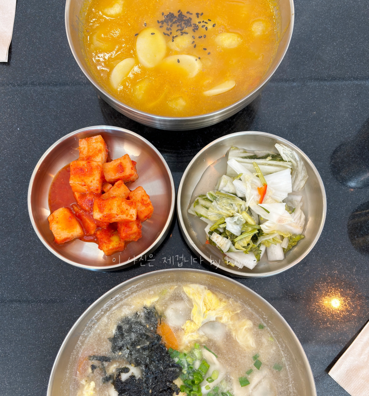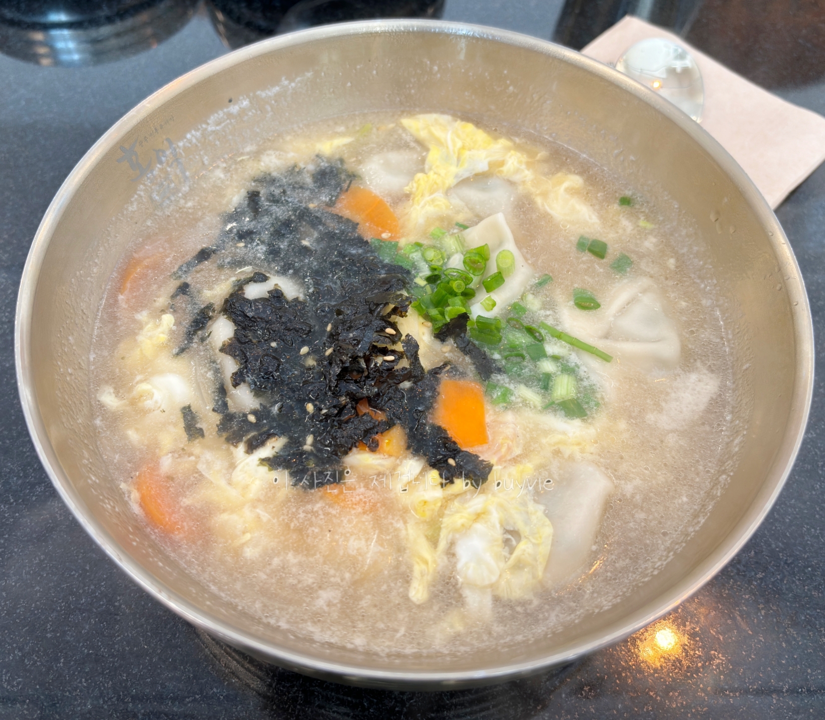 음식이 모두 나왔다. 딱 있을 것만 있는 건 내가 좋아하는 방식이기도 하다. 다만 만두국이 약간 기름져 보인다.