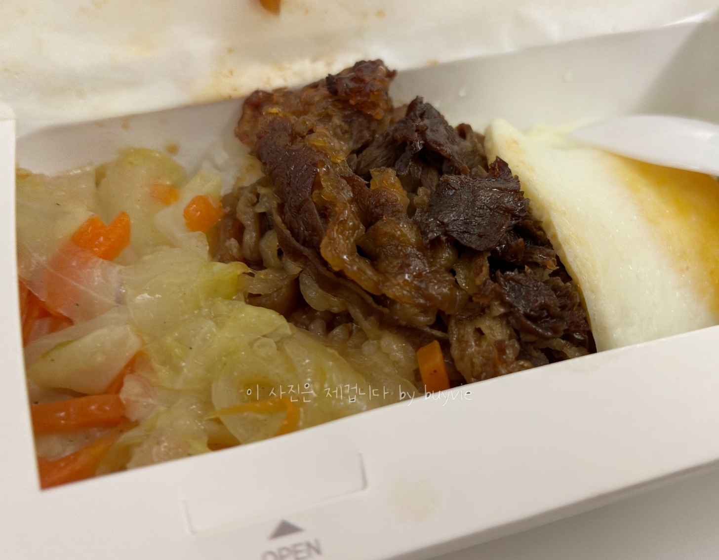 이건 불고기 덮밥인 듯. 근데 이제 완숙 계란프라이와 콩을 곁들인.