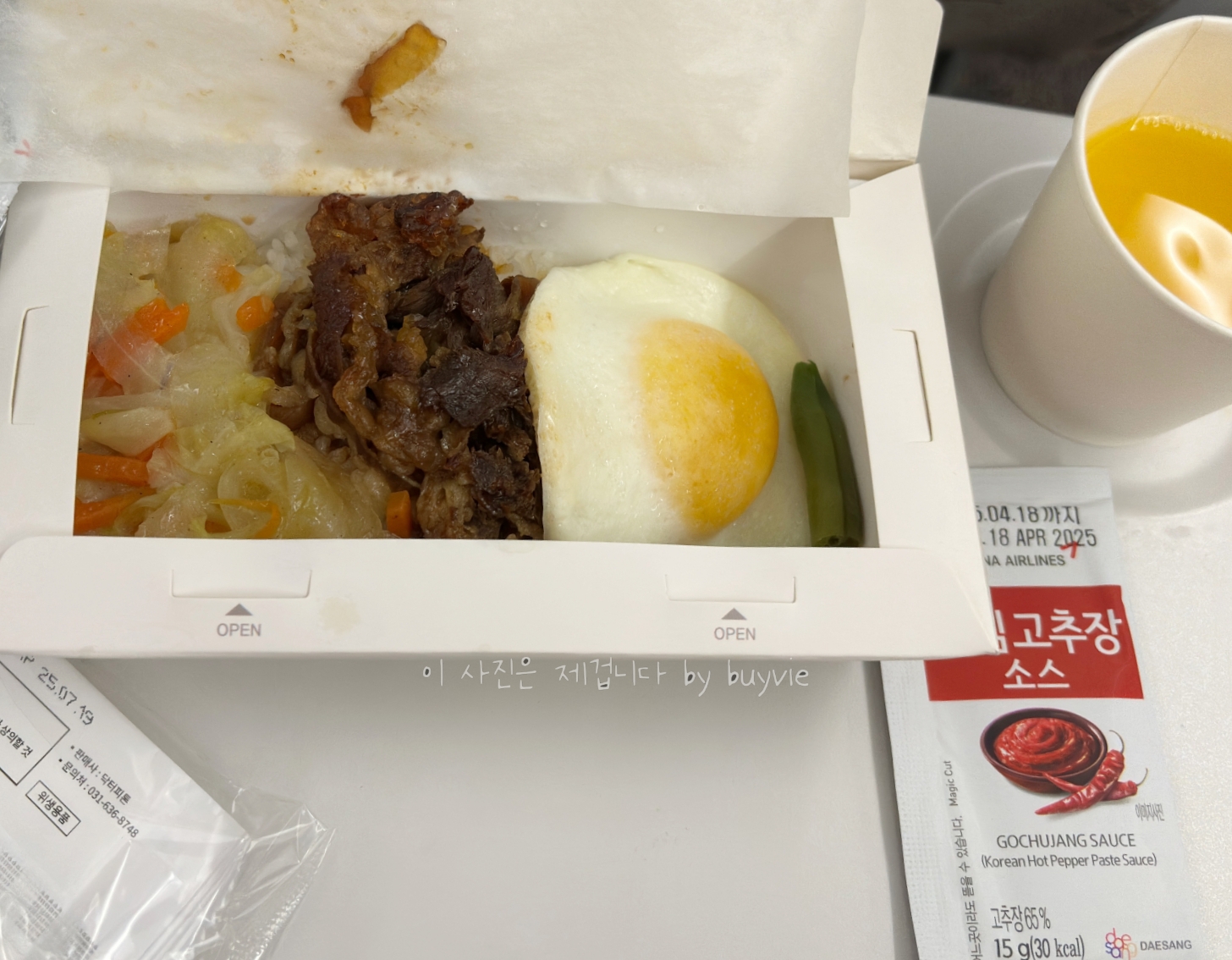 비행기가 뜬 후 아주 간단한 밥이 나온다. 그리고 한국 기내식의 시그니처랄까, 고추장도 빠지지 않았다.