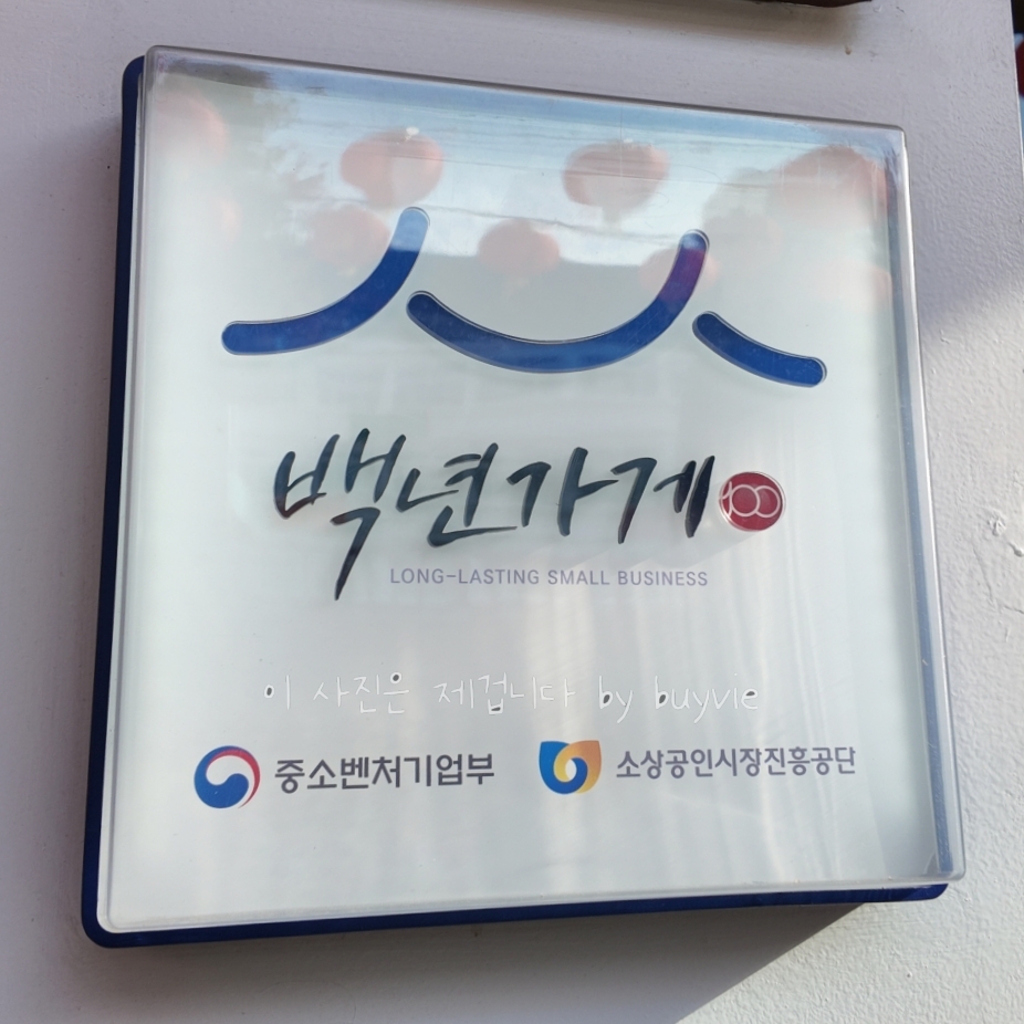 줄 서는 사람들이 가장 많이 쳐다보는 간판과 출입문이다. 이곳은 백년가게로 선정되기도 했다. 줄 서서 저 출입문이 열리기를 애타게 기다리고 사람들이 나올 때마다 다음은 누가 들어가나? 내 차례는 언제오나? 이런 거 한다. 출입문 앞에 메뉴판이 있어서 함께 온 사람들은 교대로 메뉴판 보며 먹을 걸 정하지만 혼자 온 사람은 그런 거 못함.