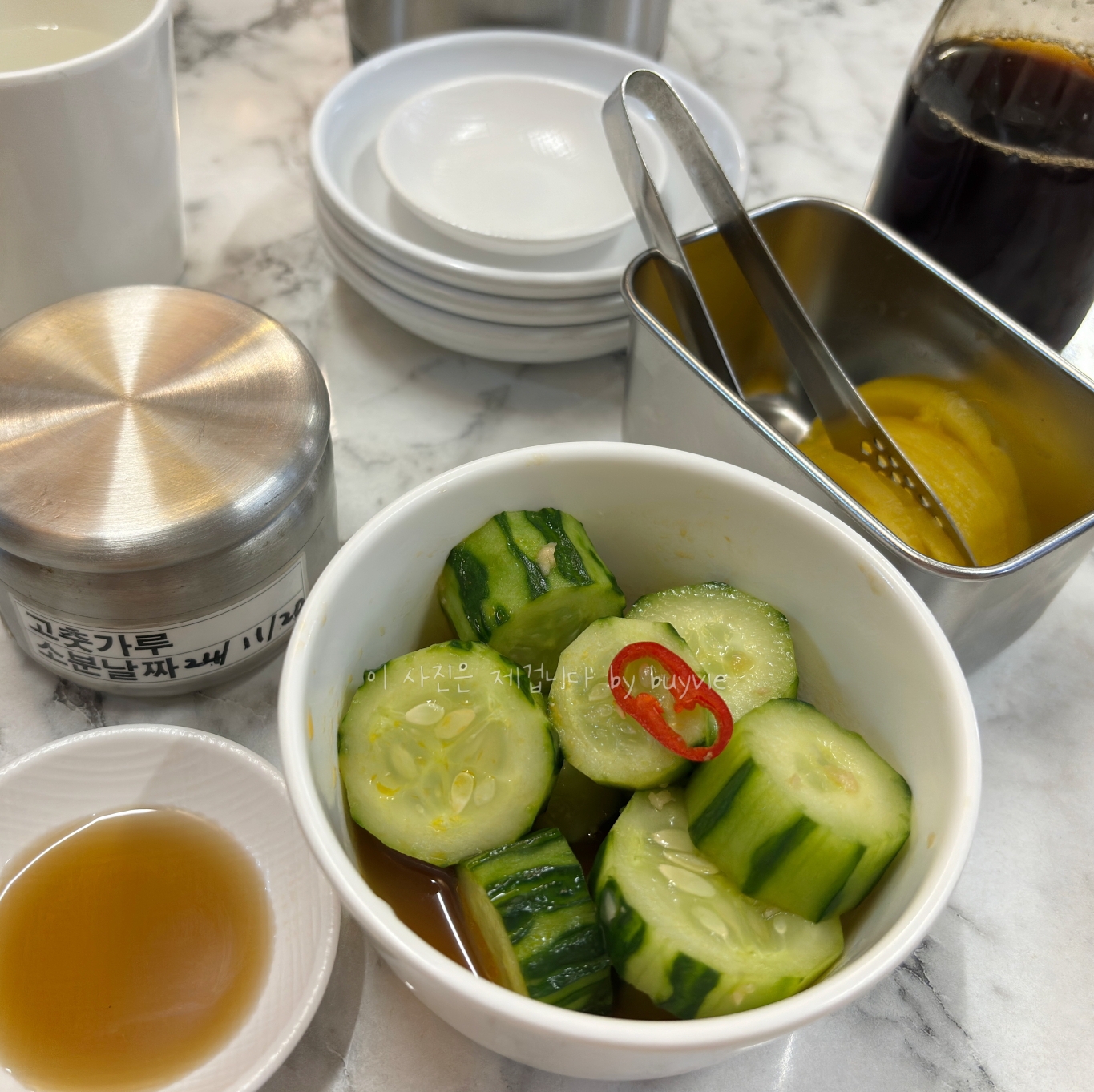 오이무침은 라유와 마늘, 식초(?)로 살짝 절인 듯, 상큼한 와중에 매운 맛이 올라온다. 만두, 기름진 중국음식과 어울리는 밑반찬이다.