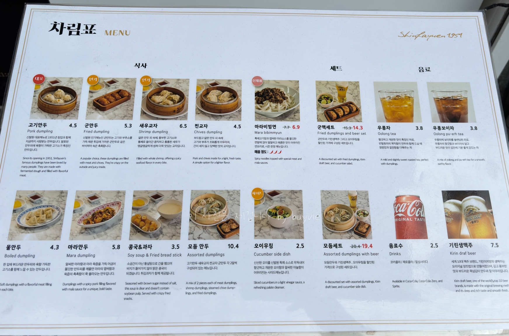 메뉴는 위와 같다. 대표메뉴라 할 수 있는 건 역시 고기만두와 군만두이다. 마라만두와 마라비빔면은 비교적 최근의 메뉴인 듯 하다. 중국정통 만두집인데 칭다오가 아니라 기린맥주가 있는 건 의외다. 사장님 취향인 듯.