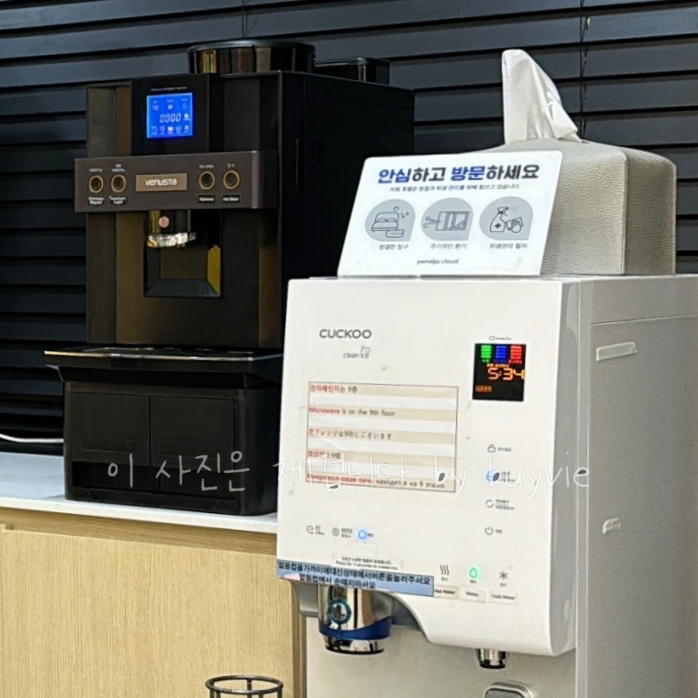 1층 프론트 데스크 옆에는 커피 머신과 정수기, 컵이 준비되어 있다. 테이블과 컴퓨터, 프린터기도 구비하고 있다.