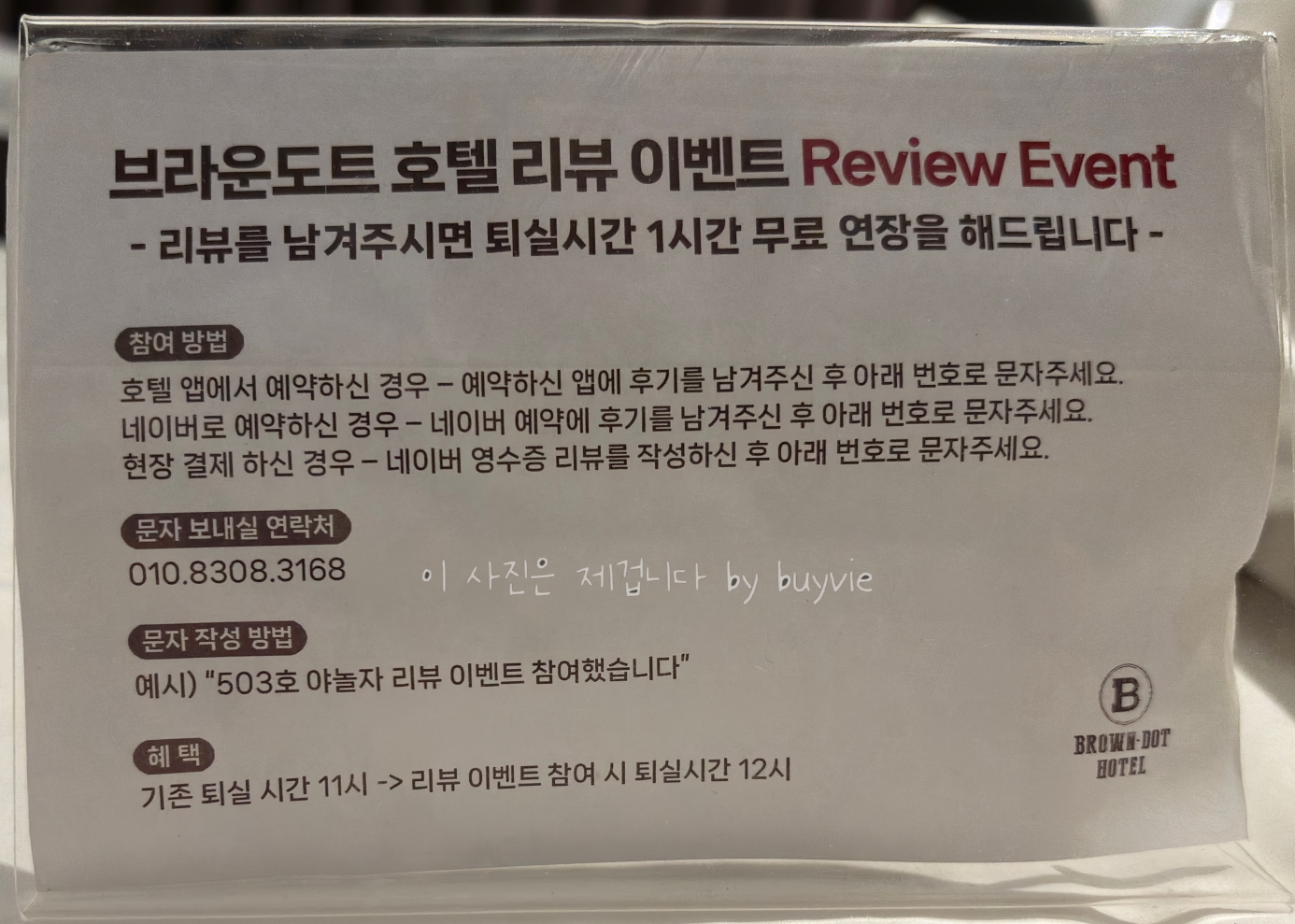 체크아웃은 11시인데 리뷰하고 확인하면 체크아웃 시간을 한시간 연장해 준다.