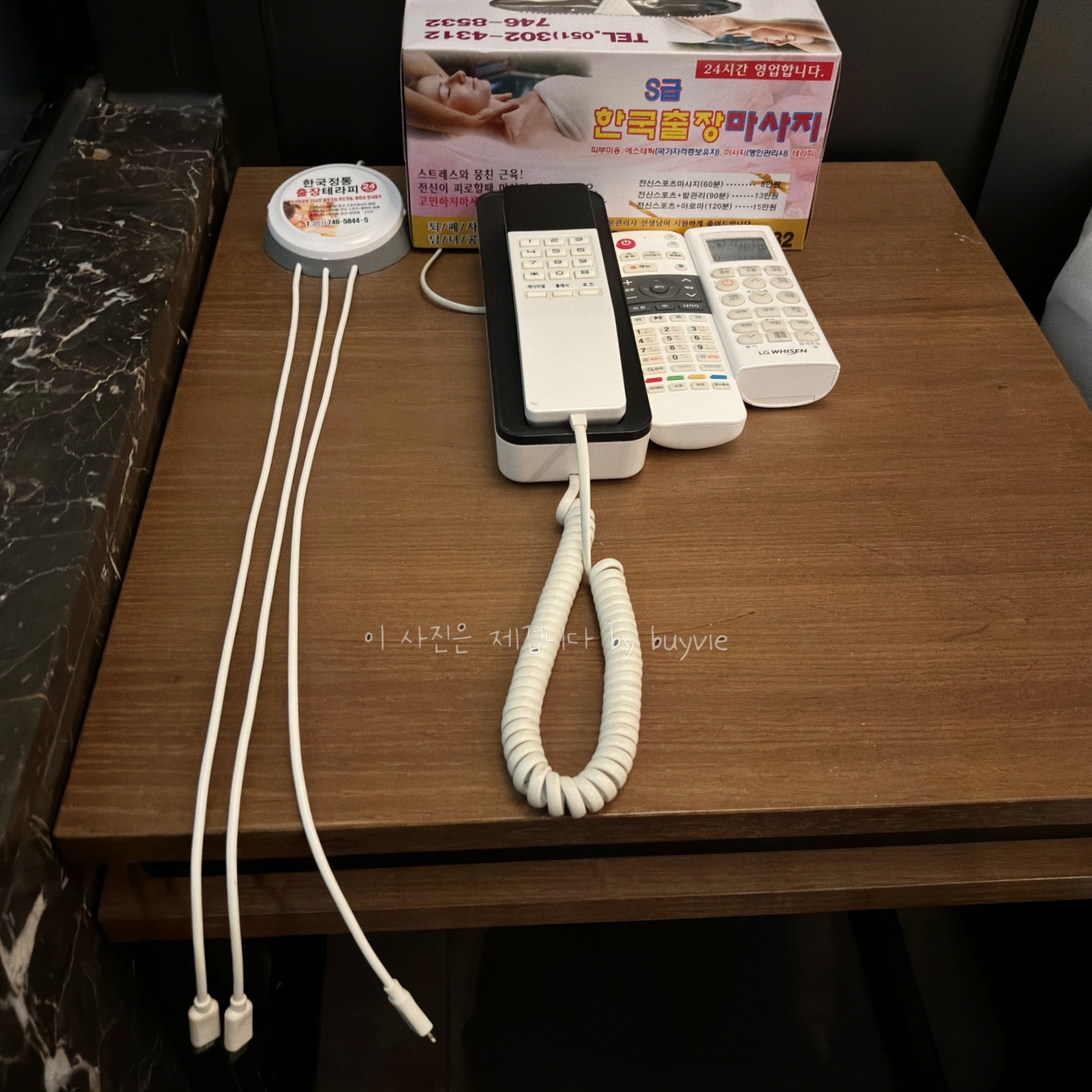 콘센트가 침대 끝에 있는데 과거에 중국인 여행자를 많이 받았거나 중국여행자 대상이었는지 3구짜리 콘센트의 구멍을 하나씩 막았다. 어떤 건 되고, 어떤 건 안된다. 드라이기 가까이에 있는 콘센트는 되고 침대 쪽 컨센트는 작동하지 않았다. 그래서 출장마사지 충전기를 유용하게 썼다.
