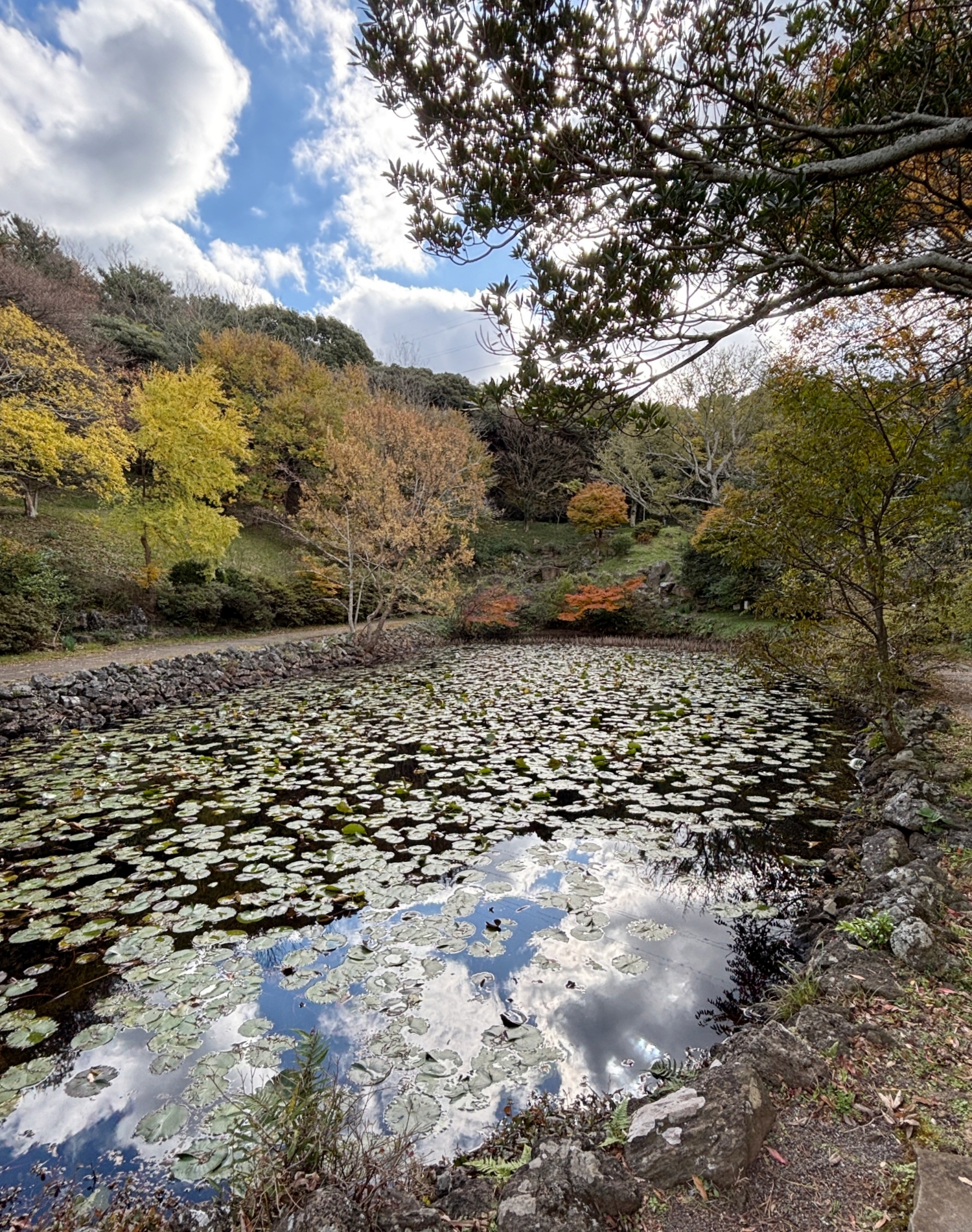 아직 연못에도 수생식물들이 초록을 가지고 있다. 물은 파란하늘을 비춘다.